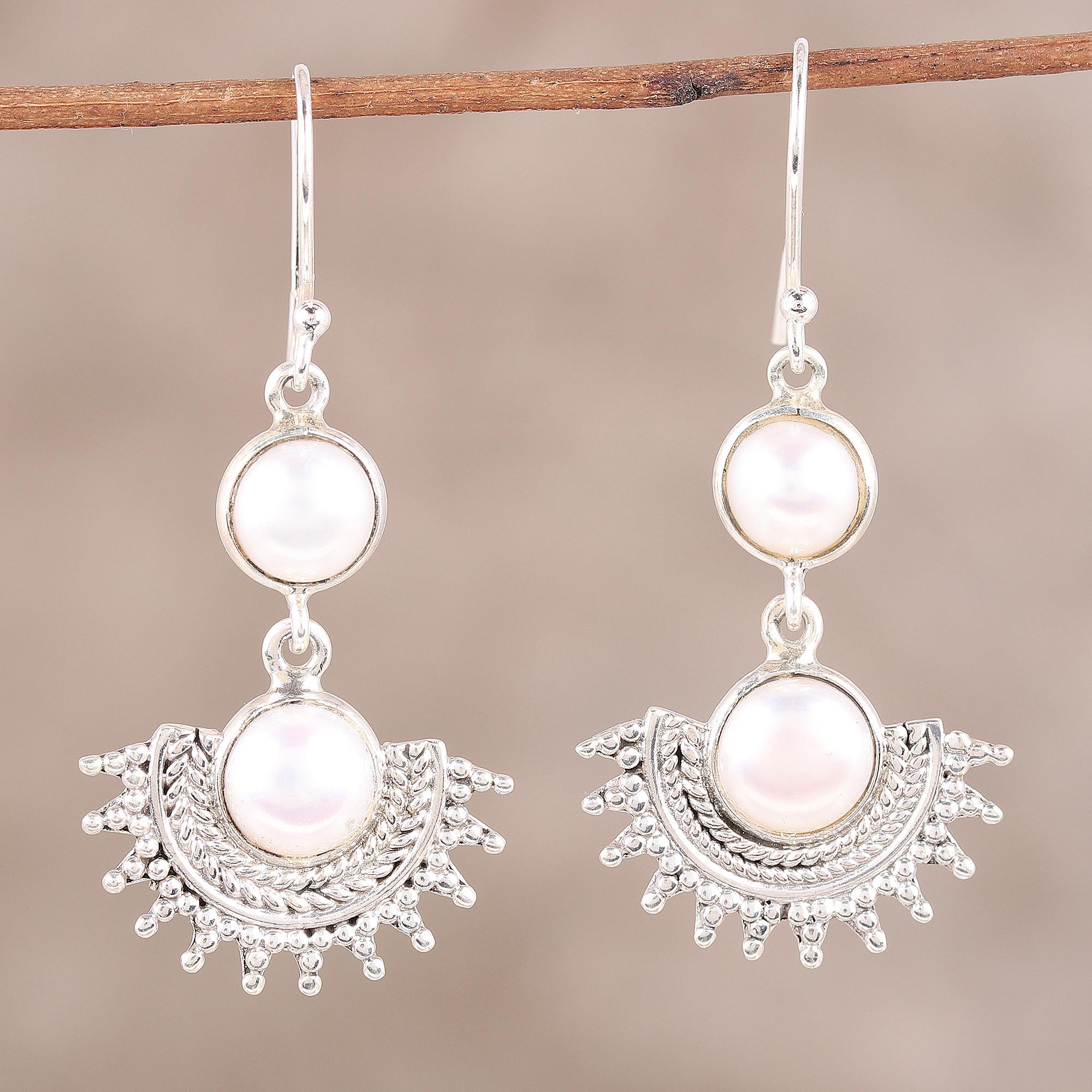 India's Pawanesh Gupta crafts earrings replete with luminous radiance. Ornate sterling silver settings enhance the beauty of creamy cultured pearls. Like fancy fans, the pair dances on shining hooks.