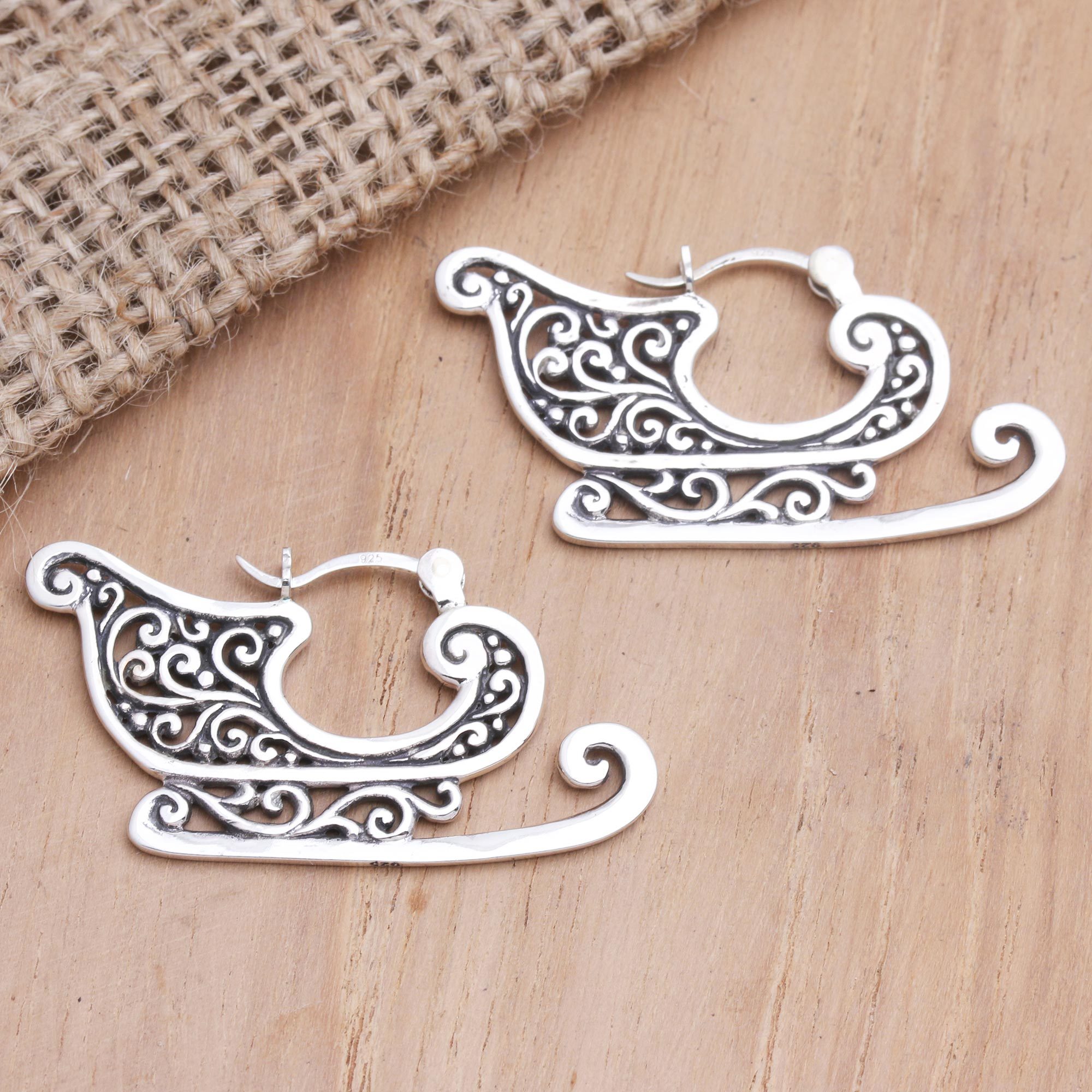 Santa's sleigh is on its way! Nyoman Ariawan's adorable earrings are a great way to celebrate the holiday season. Balinese artisans hand craft the earrings from sterling silver, engraving the sleigh's interior with curling designs that pop against an oxidized background.