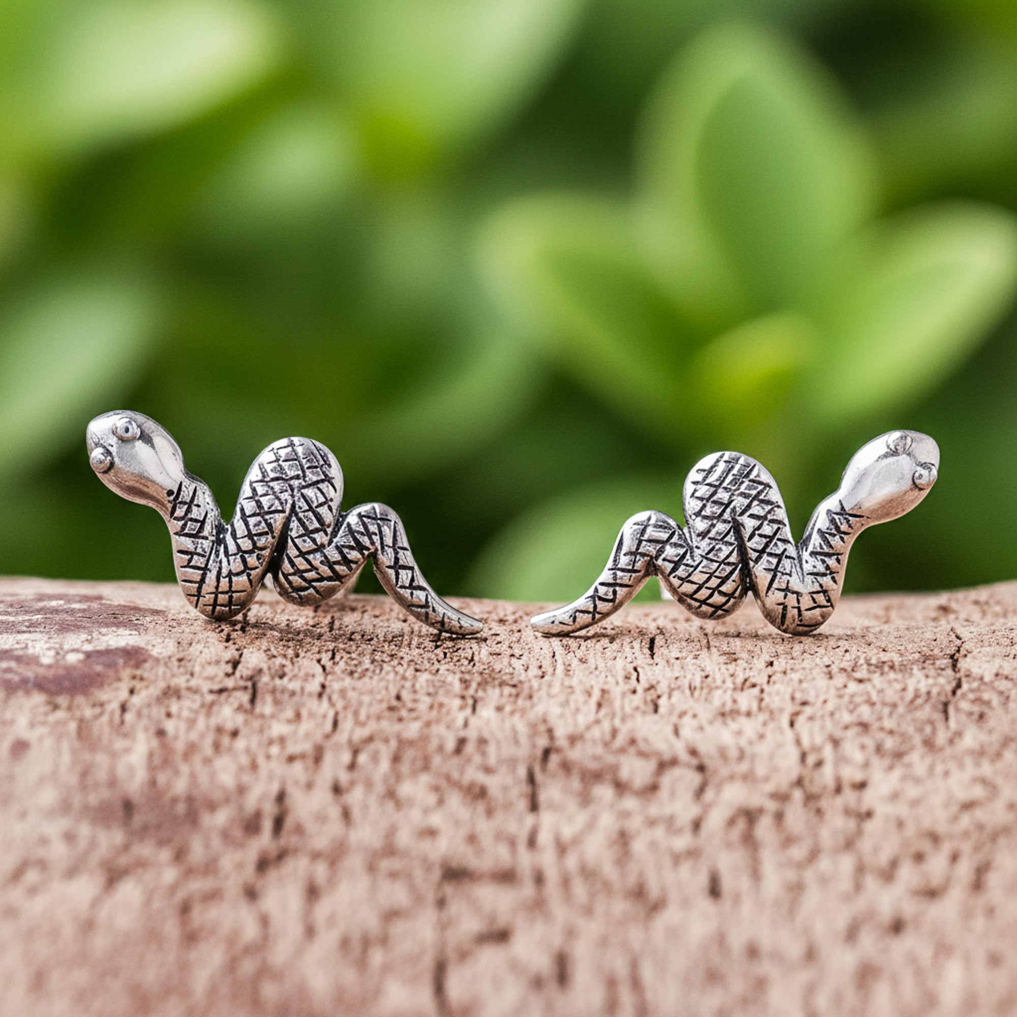 Bodies coiled into wavy patterns, two cute snakes adorn the ears. Wadarat Suparisisuk presents these charming button earrings, crafted of sterling silver by Thai artisans.