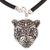Crafted from Taxco silver, the stylized face of a fierce jaguar forms the pendant for this necklace. Intricate oxidized patterns decorate the spotted jungle cat revered by the Maya. By Angel Ortiz, this handsome and striking necklace sets the sterling pendant on a black rubber cord for contrast