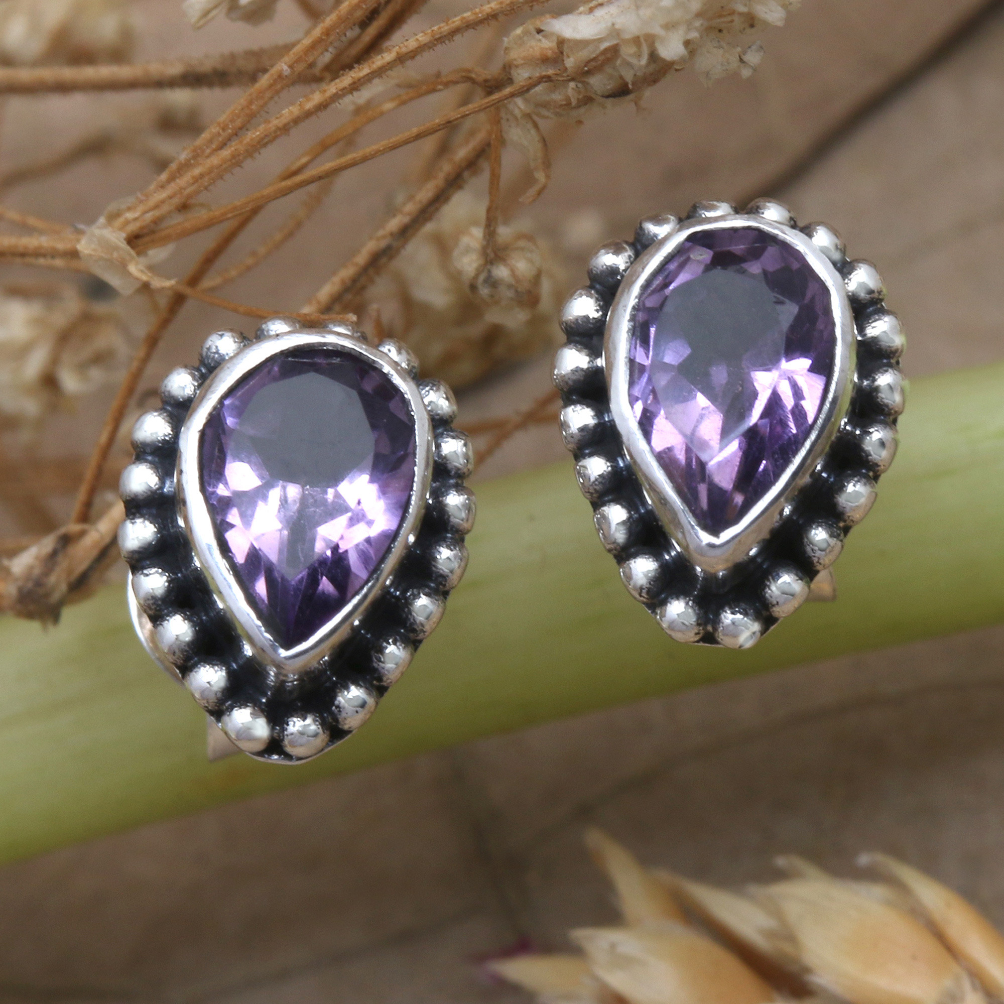 Sterling Silver Stud Earrings with Pear-Shaped Amethyst Gem, 'Delighted Heart in Purple'