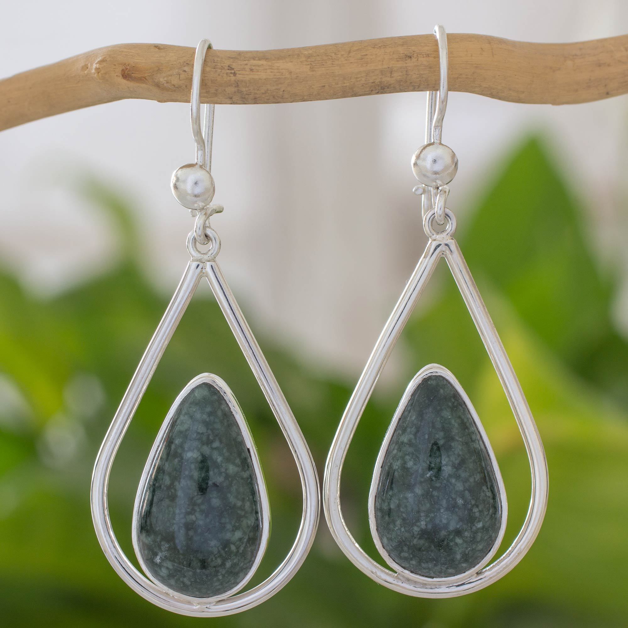 Sleek and elegant, teardrops of sterling silver host droplets of jade. By Estuardo Jimenez, the handcrafted earrings showcase the dappled beauty of dark green gemstones.