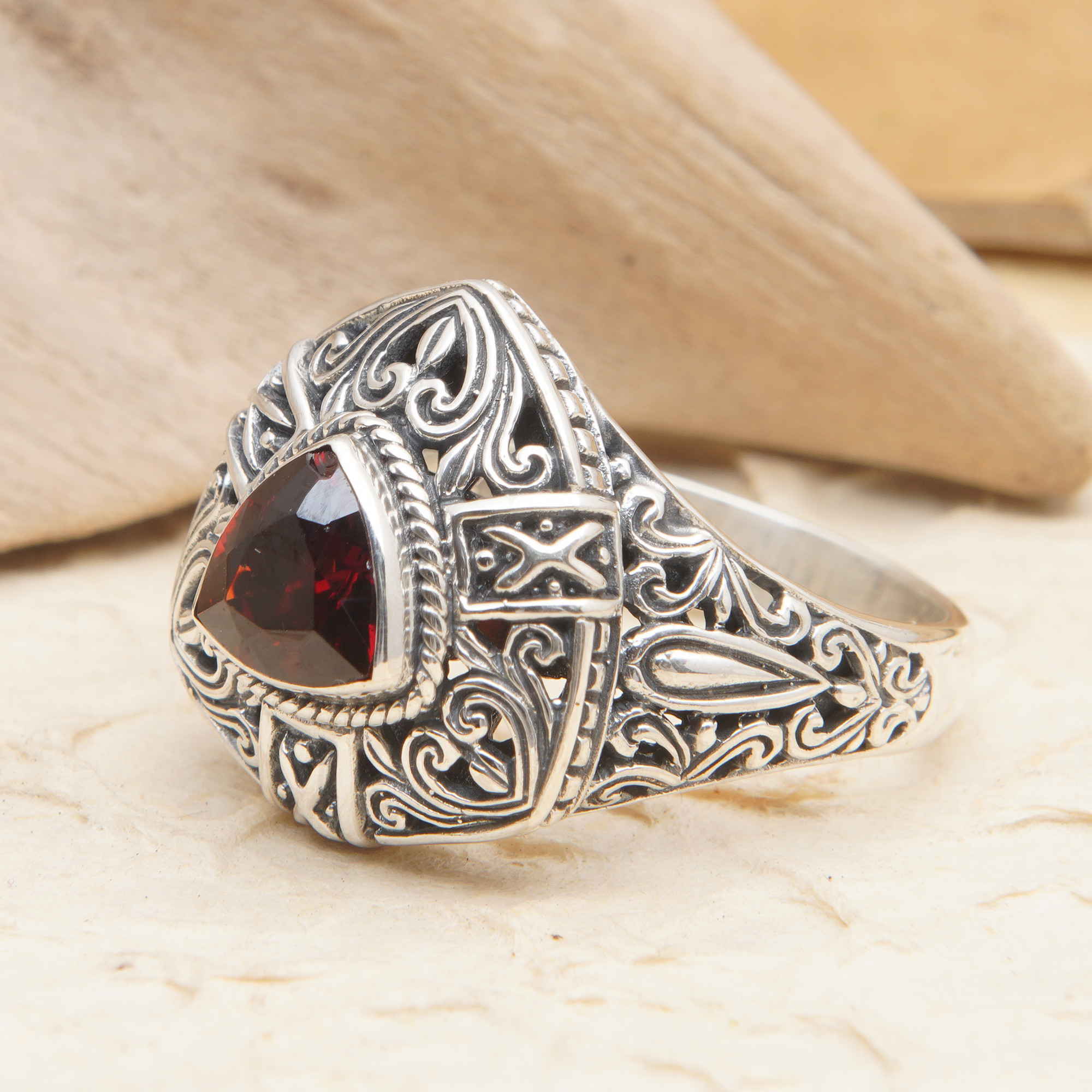 Slip on this breathtaking triangular cocktail ring and leave a lasting impression thanks to the vibrant pop of a fiery garnet stone. Designed by Ketut Udiana, it boasts a sterling silver setting accented by polished and oxidized finishes, perfectly complementing the gem's rich red hue. In this must-have accessory, classic Balinese motifs flow seamlessly from front to band with chic elegance.