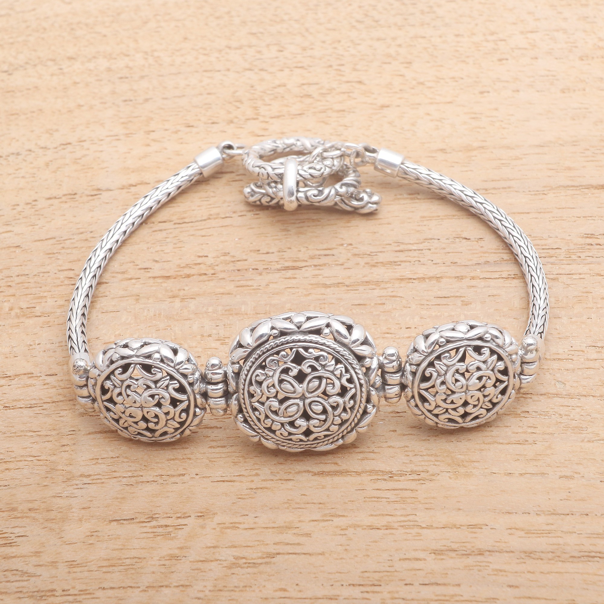 Enchanting and beautiful, three round pendants are detailed with lovely and intricate openwork patterns in sterling silver. Each pendant is ringed with traditional seed patterns. Balinese artisan Kadek Hendra creates this bracelet, which encircles the wrist with sterling naga chain.