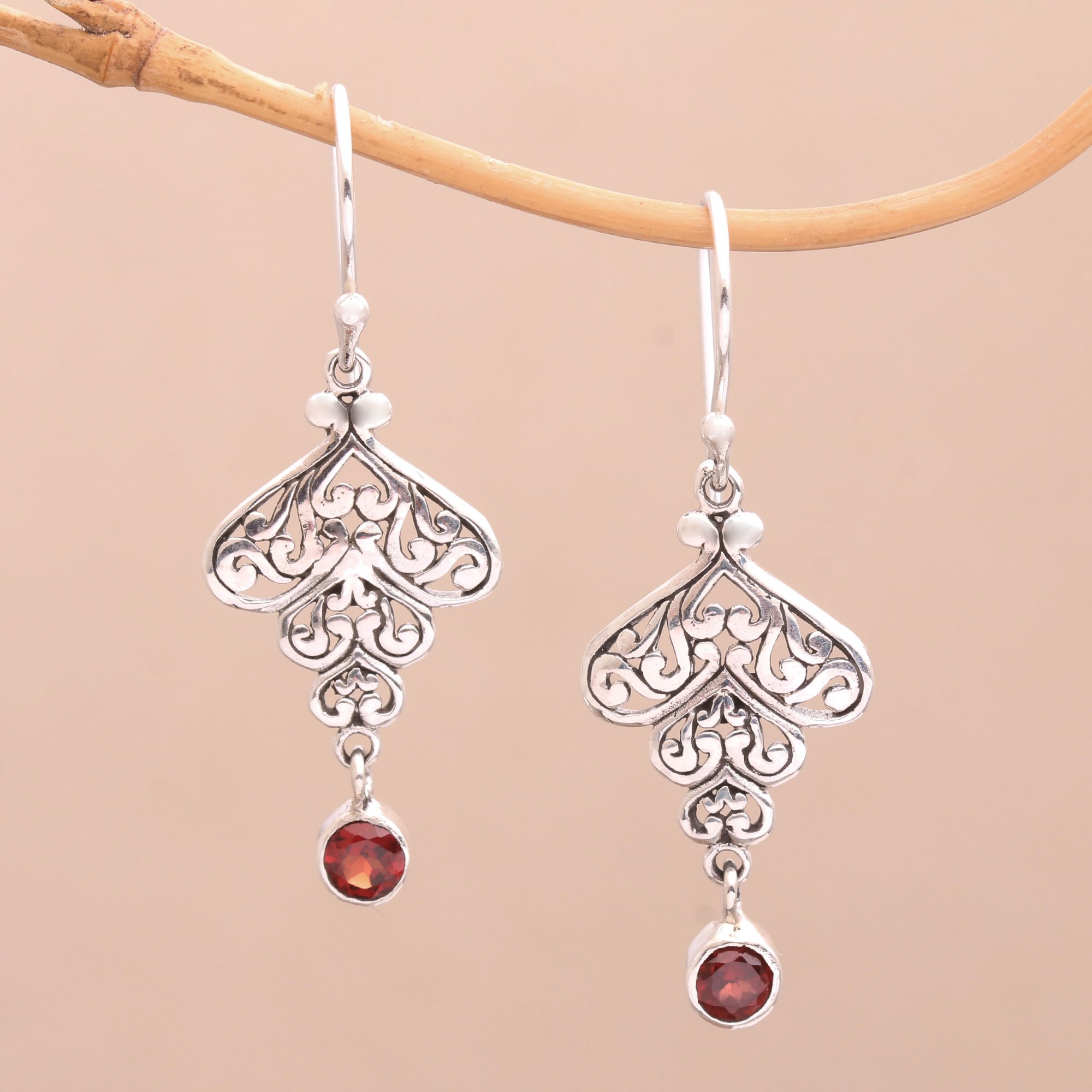 Ornate layers of tumbling hearts culminate to form faceted red garnet droplets. Handmade by Wayan Lasti in Bali, these earrings are comprised of sterling silver. The pair will add a feminine touch to any look.