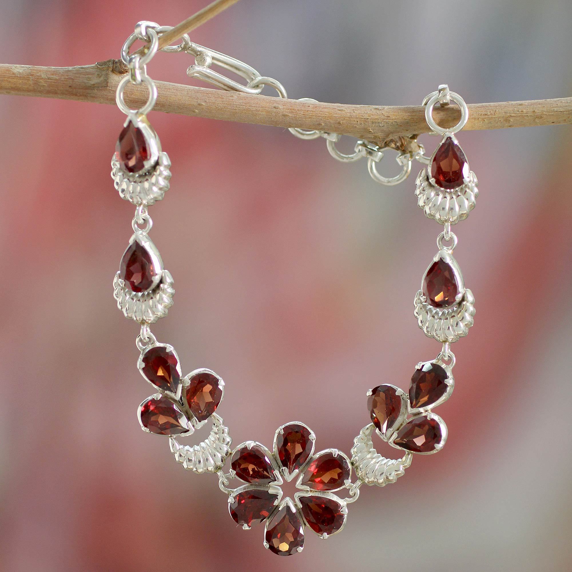 Raindrop-shaped lovely garnets are adorned in a floral pattern, surrounded by a sterling silver outline. Shubhra Singh skillfully handcrafts this awesome sterling silver and faceted garnet bracelet. This spectacular radiating sterling silver and garnet bracelet beautifully adorns your wrist for all occasions, whether a formal ball or everyday times out with friends.