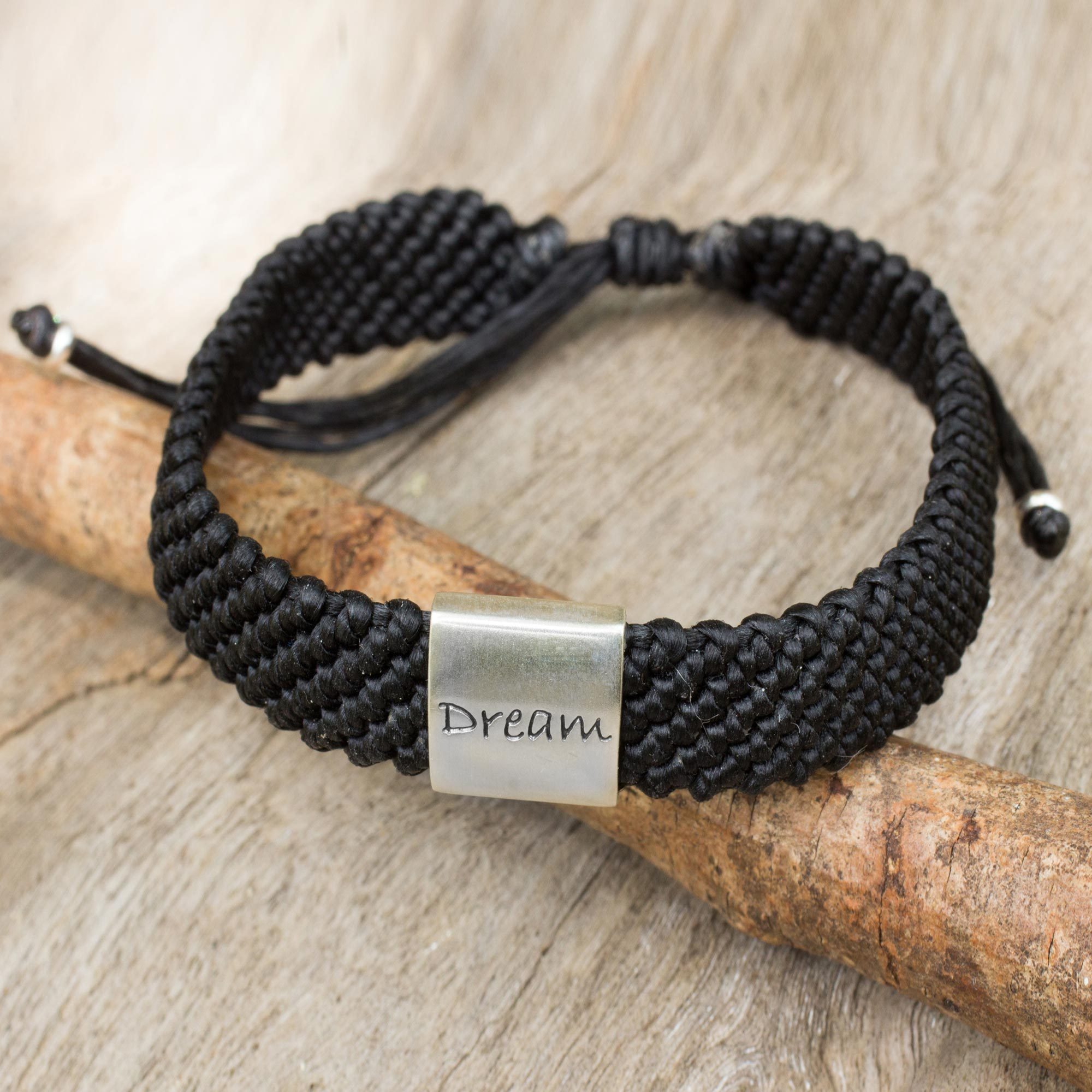 Engraved in sterling silver, the word "Dream" is a word of encouragement from Napapat. This textured bracelet is knotted by hand in beautiful symmetry. It slips over the wrist, and the length can be adjusted by sliding the knot along the cords.