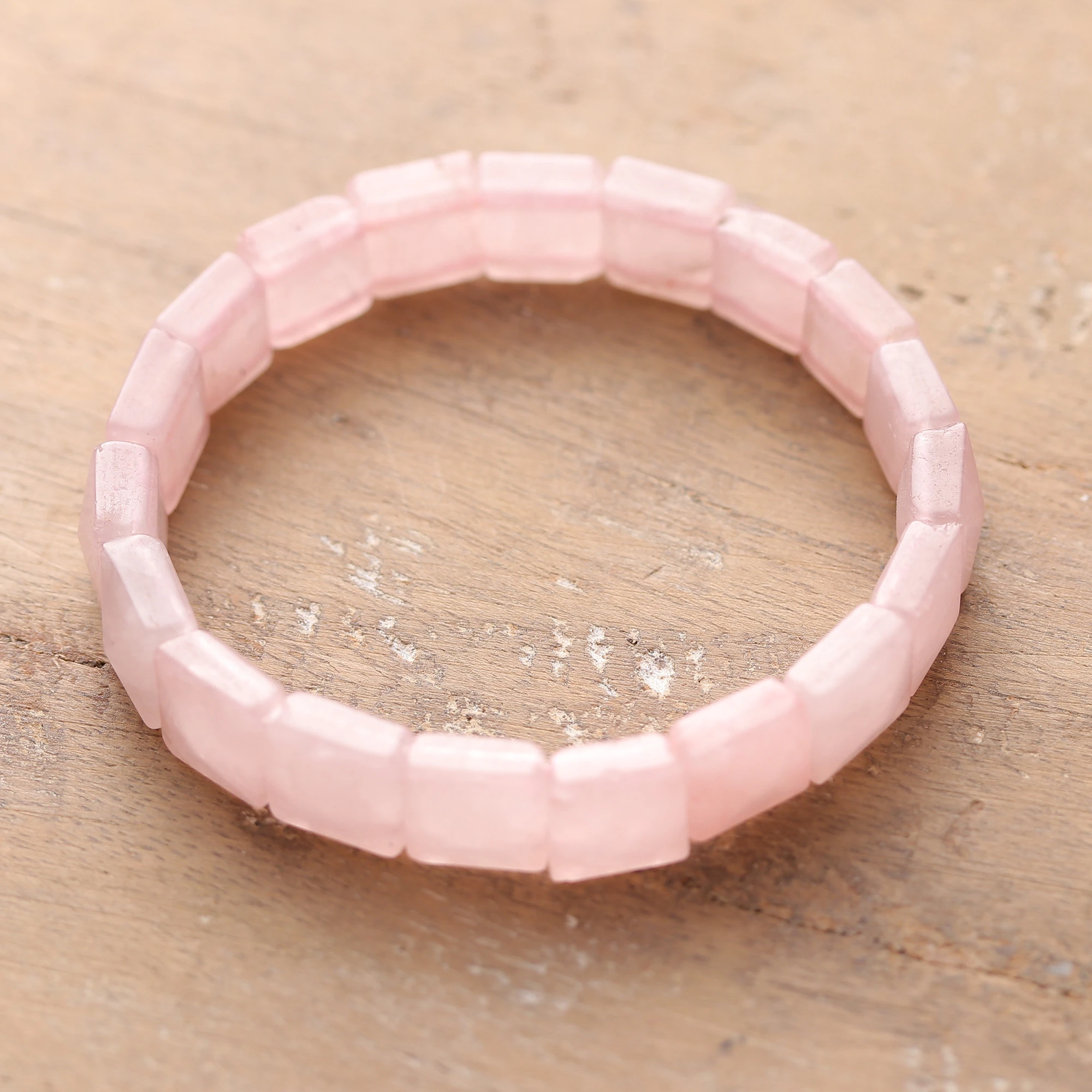 This delicate stretch bracelet showcases a sequence of rectangular rose quartz tiles that radiate a soft pink warmth against the skin. The pale hue of this stone exudes a gentle and soothing aesthetic, often associated with love, calming energy and emotional healing. In this sweet design by Indian artisan Swasti Jain, the smooth gems line up with perfect precision, creating a fluid band that moves comfortably with every gesture while maintaining its elegant form.