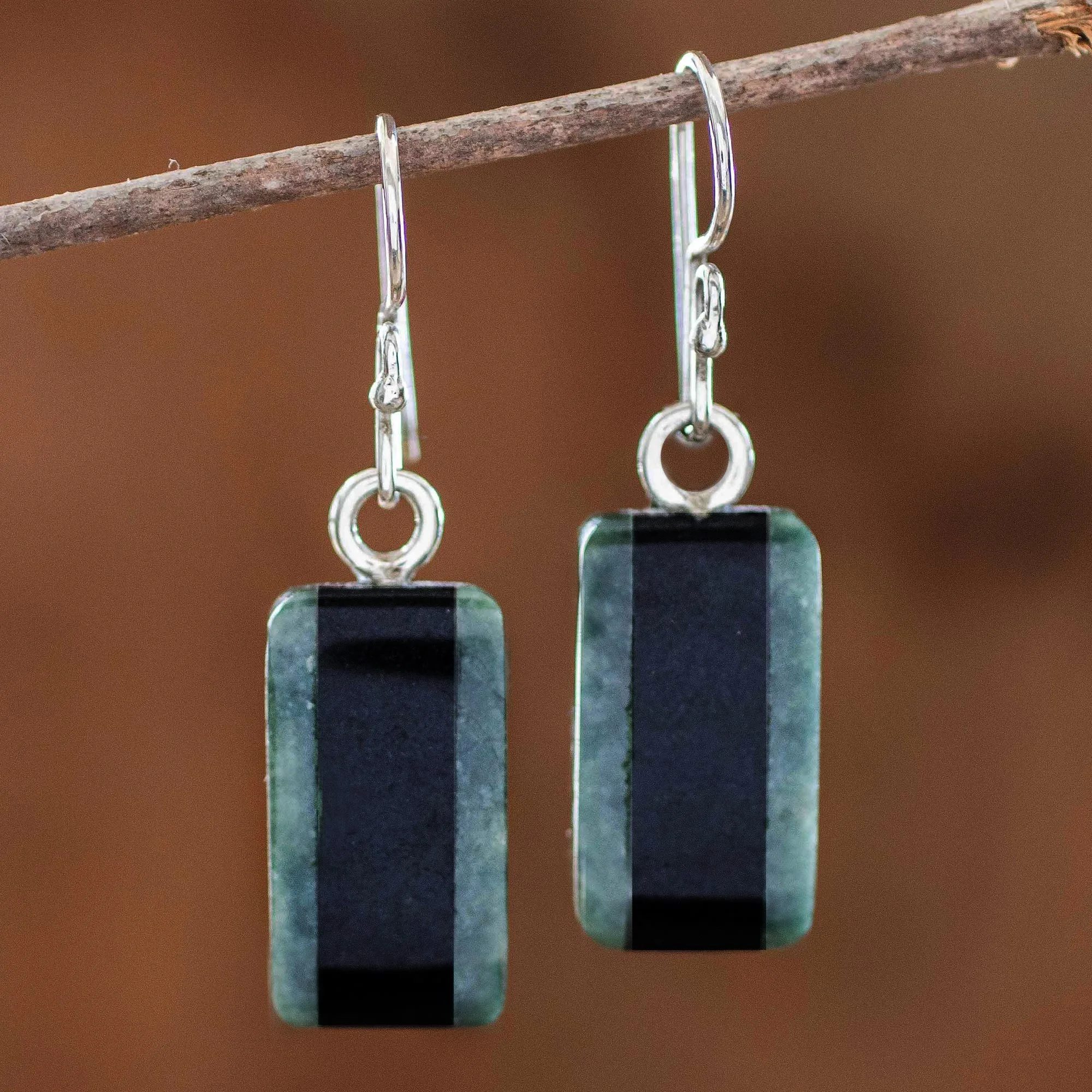 Striped Dark Green and Black Jade Earrings from Guatemala, 'Black Forest Road'
