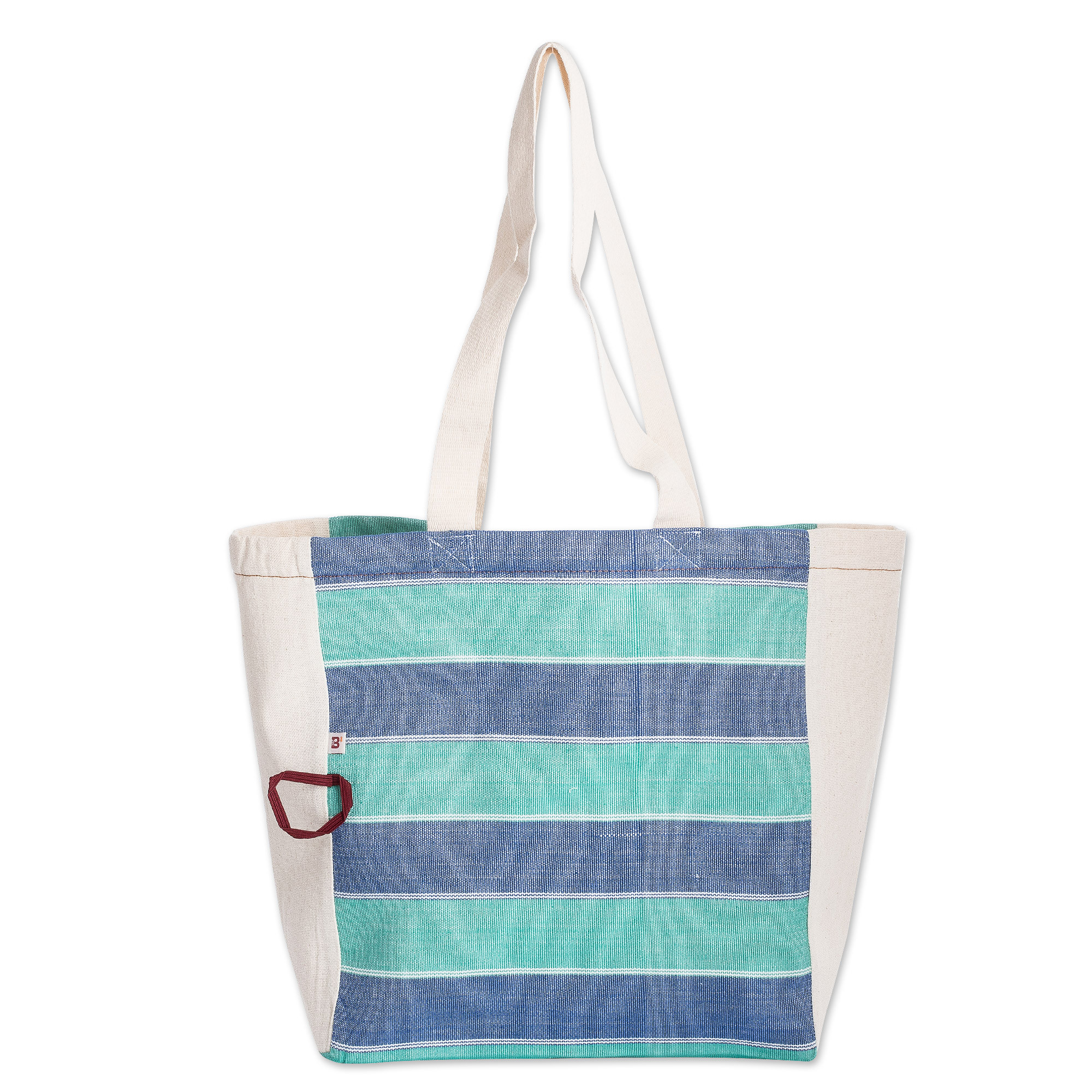 Add a touch of chic to your everyday shopping essentials with this fabulous foldable tote bag hand-woven in cotton and with plenty of space to carry all your must-haves. Designed by Guatemala's Fernando and Ana Cecilia, this stunning bag comes in a beige hue with striking azure and turquoise stripes for a fashion-forward look. With a convenient elastic band on the front to keep it neatly folded when not in use and a fully lined interior, this tote bag is the ultimate combination of style and practicality.