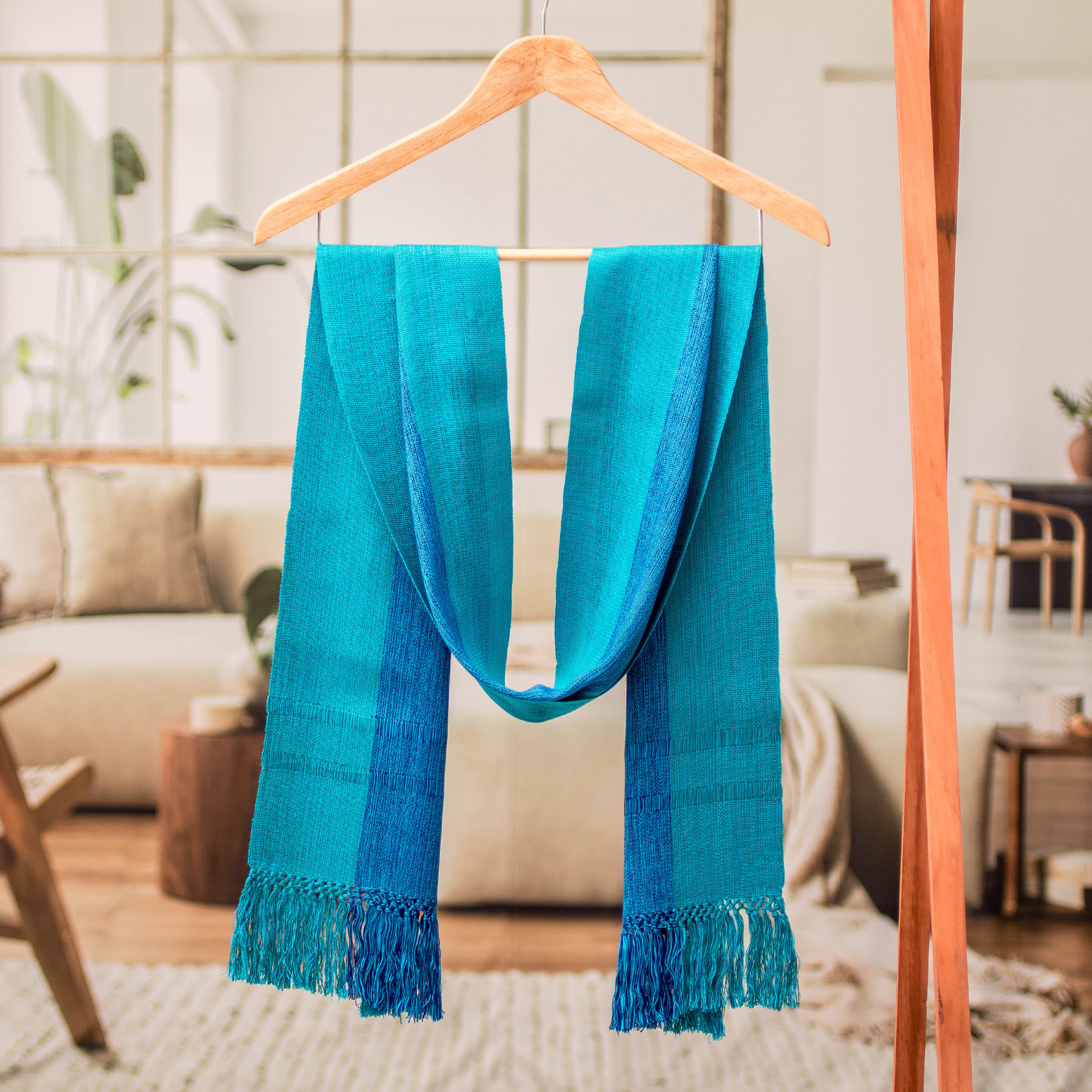 Fluid as water yet light as air, this hand-loomed striped scarf transforms blue into a statement of quiet confidence. Each rayon thread passes through the skilled hands of Ranm Ixoqi' artisans in Guatemala, resulting in an accessory that flows with remarkable grace. The lively fringe edging dances with your movements, adding dimension to the scarf's linear pattern. From brisk morning commutes to sunset strolls, this versatile textile companion brings warmth and charm to countless styling possibilities.
