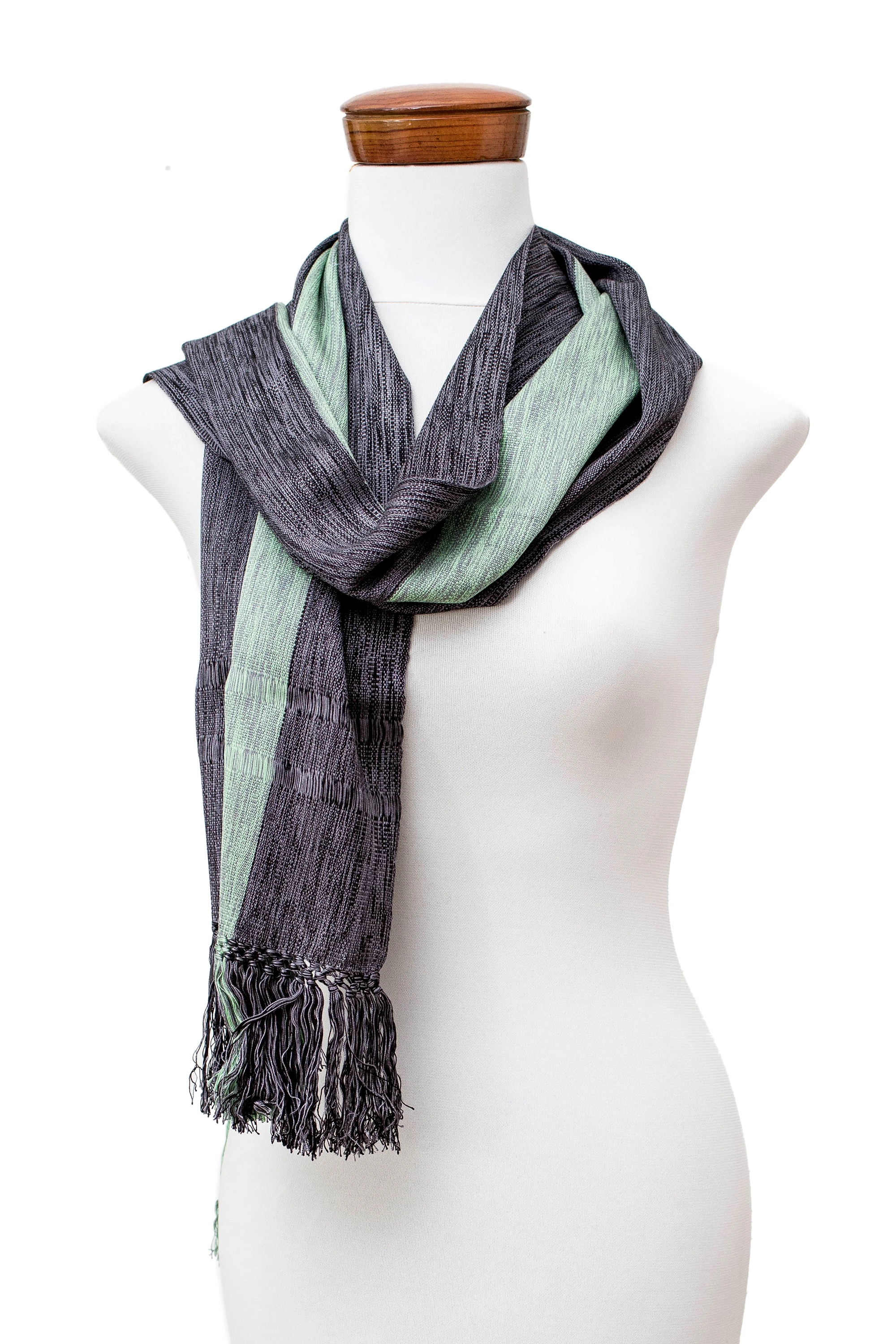 Striped Handwoven Fringed Rayon Scarf in Grey Green Black, 'Exquisite Combination'
