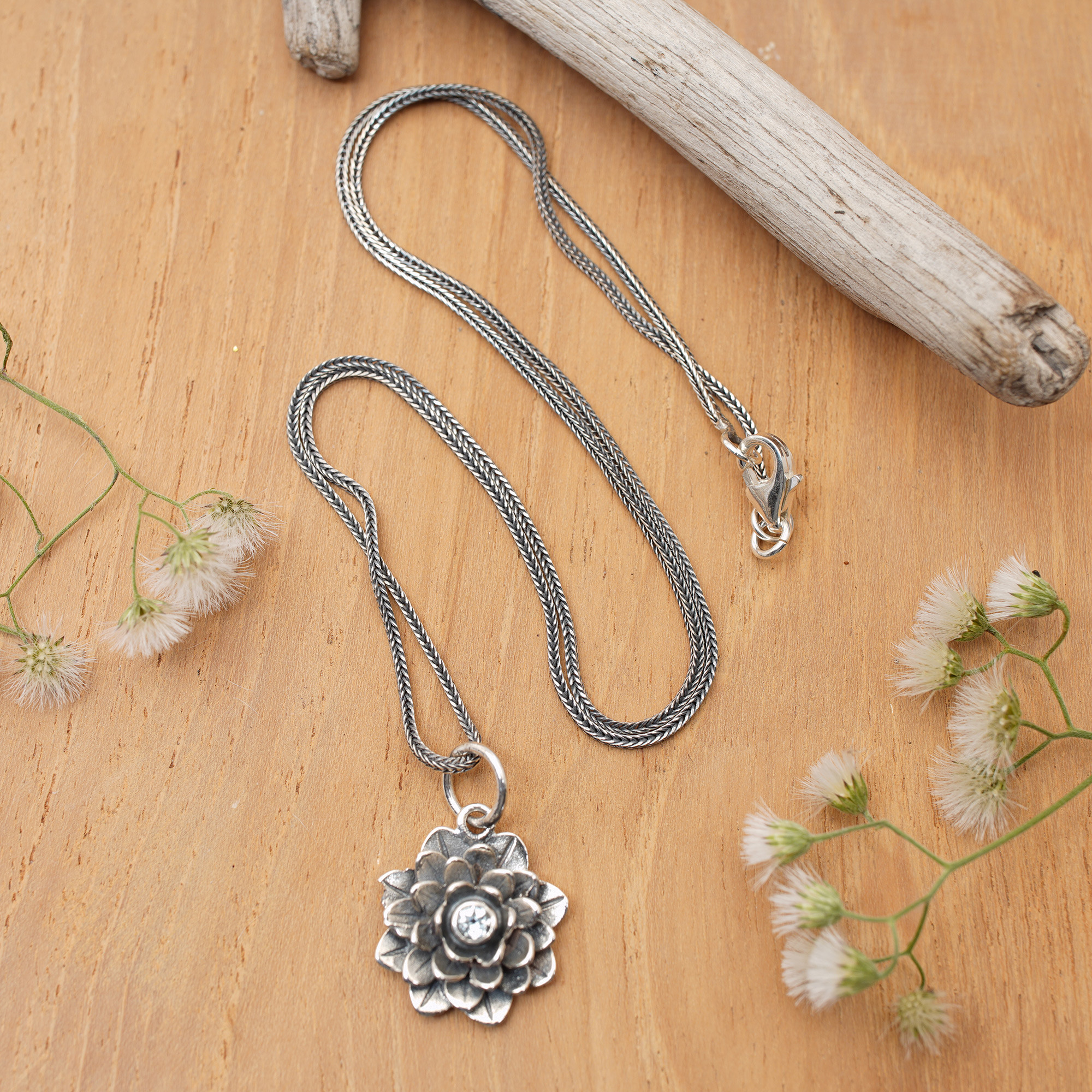 Stunning Blue Topaz Lotus Sterling Necklace from Java, 'Silver Lotus Blossoms'
