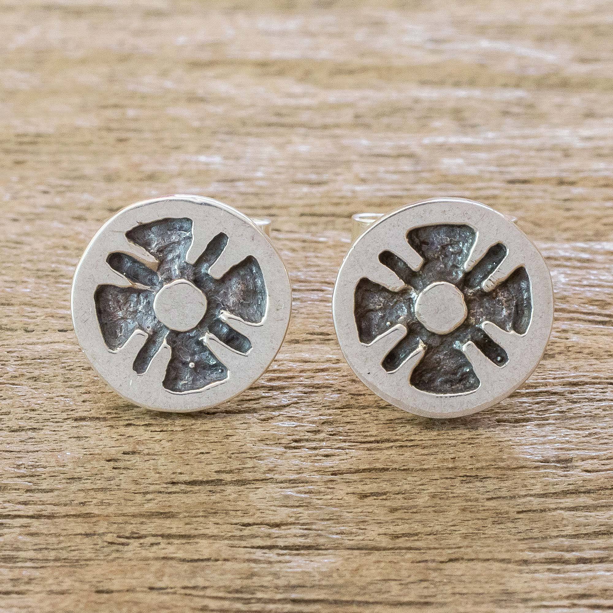 Nicte Migliozzi of Guatemala works with sterling silver to create beautiful jewelry like these unique stud earrings. The studs feature an oxidized impression of a stylized flower; according to the Maya, the flower was associated with femininity and fertility.