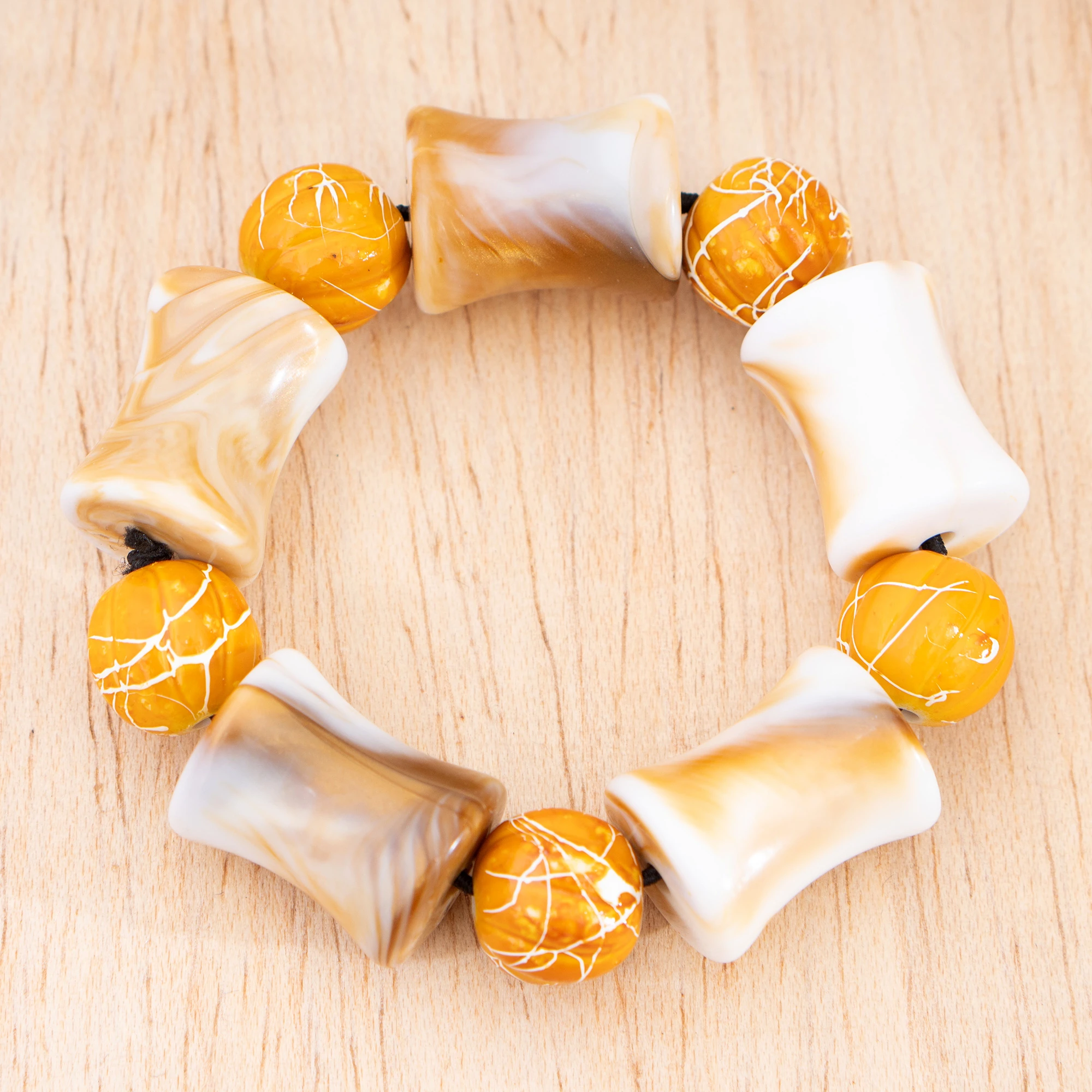 A piece from the Ghanaian sun appears to transform into a gorgeous bracelet, crafted by the expert hands of artisan Erica Yeboah. Recycled glass beads in a palette of yellow and ivory hues compose this elegant piece, equipped with an elastic cord to allow a fitted look.