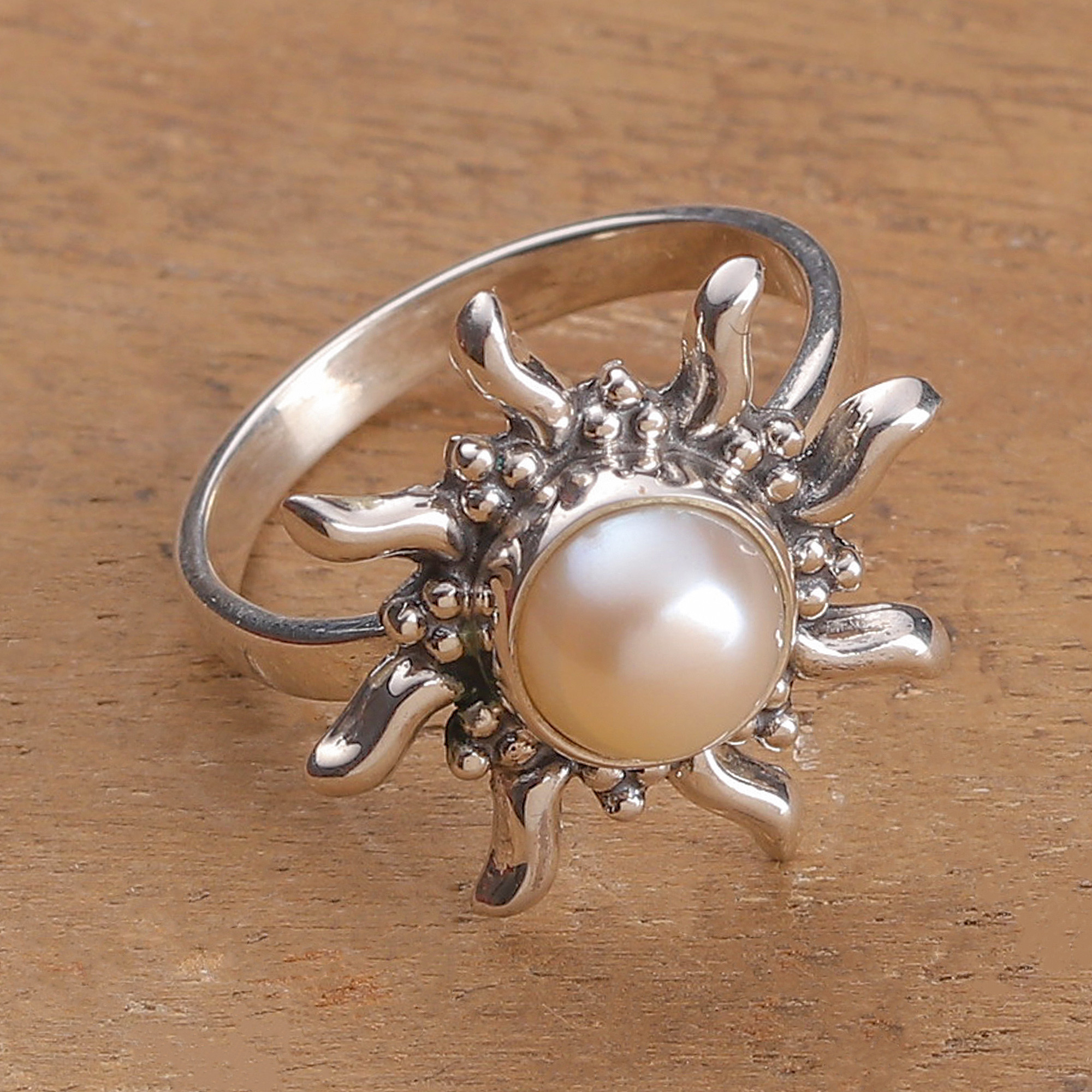 Sun-Shaped Natural Cream Pearl Sterling Silver Cocktail Ring, 'Sun under the Sea'