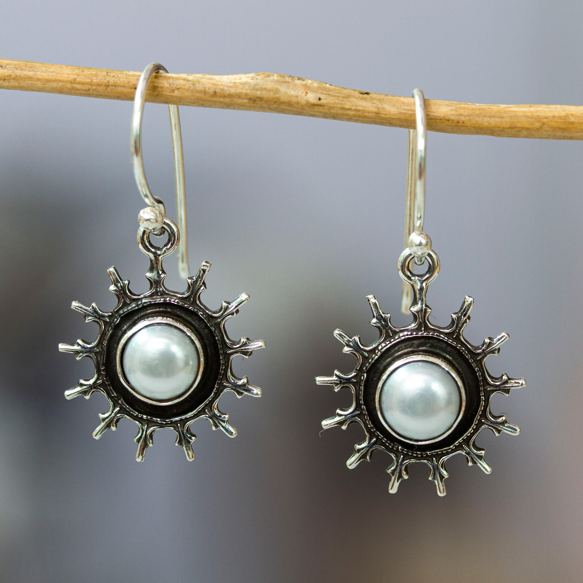 Sun-Shaped Sterling Silver and White Pearl Dangle Earrings, 'Pearly Dawn'