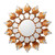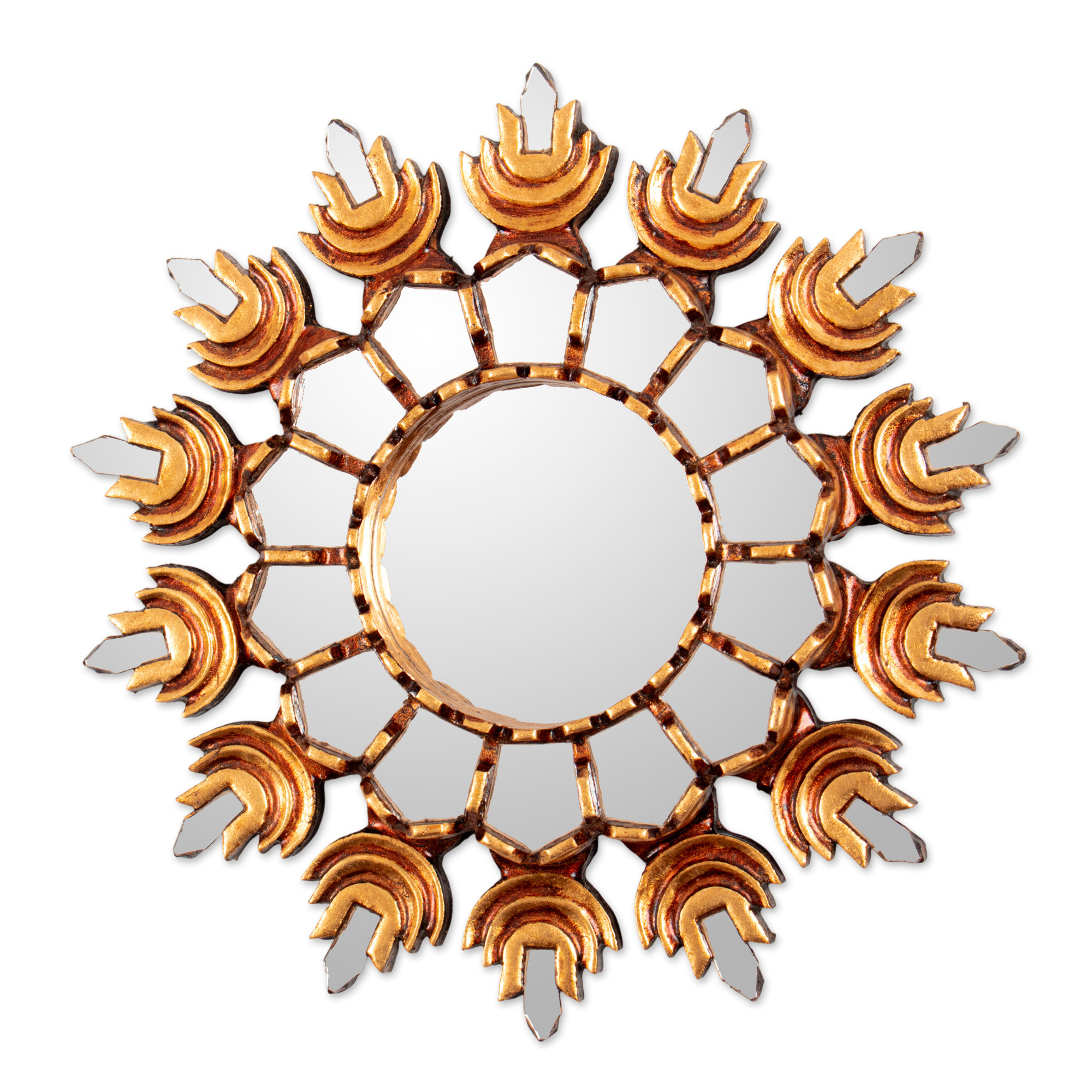 Golden crescents ripple outward in perfect symmetry, creating a wall mirror that radiates warmth and old-world sophistication from every angle. This sun-inspired design features layered mohena wood arcs that stack like waves of light, each one punctuated by reflective glass shards that multiply the visual impact. Artisan Gliseria Soto achieves the mirror's timeworn character through careful application of bronze gilt and walnut stains, building a finish that looks like it's been kissed by decades of Peruvian sunlight. The geometric arrangement of wooden curves and mirrored sections creates mesmerizing depth, while the lattice-like framework surrounding the central mirror adds architectural interest that works beautifully in both traditional and contemporary spaces.