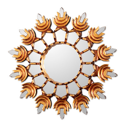 Sun-Themed Bronze-Gilded Antique-Finished Wood Wall Mirror, 'Andean Sun'