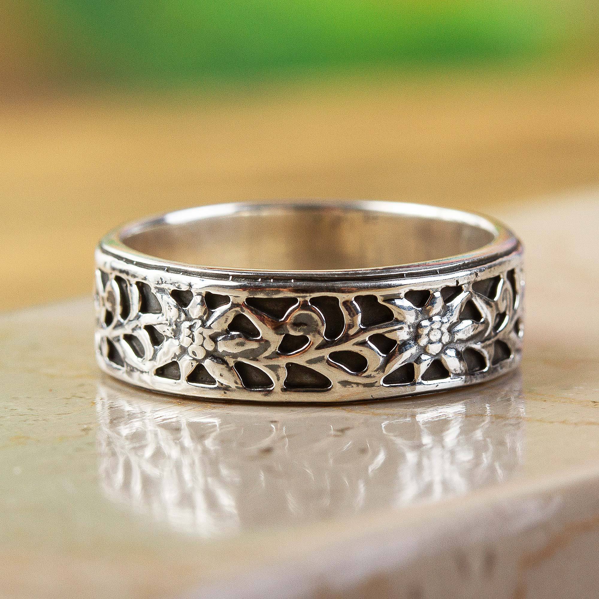 Working with 950 silver from Taxco, Mexico, Alon Diller creates this beautiful band ring. The subtle band features a garland of openwork sunflowers, with dark oxidation bringing their beauty to the forefront.