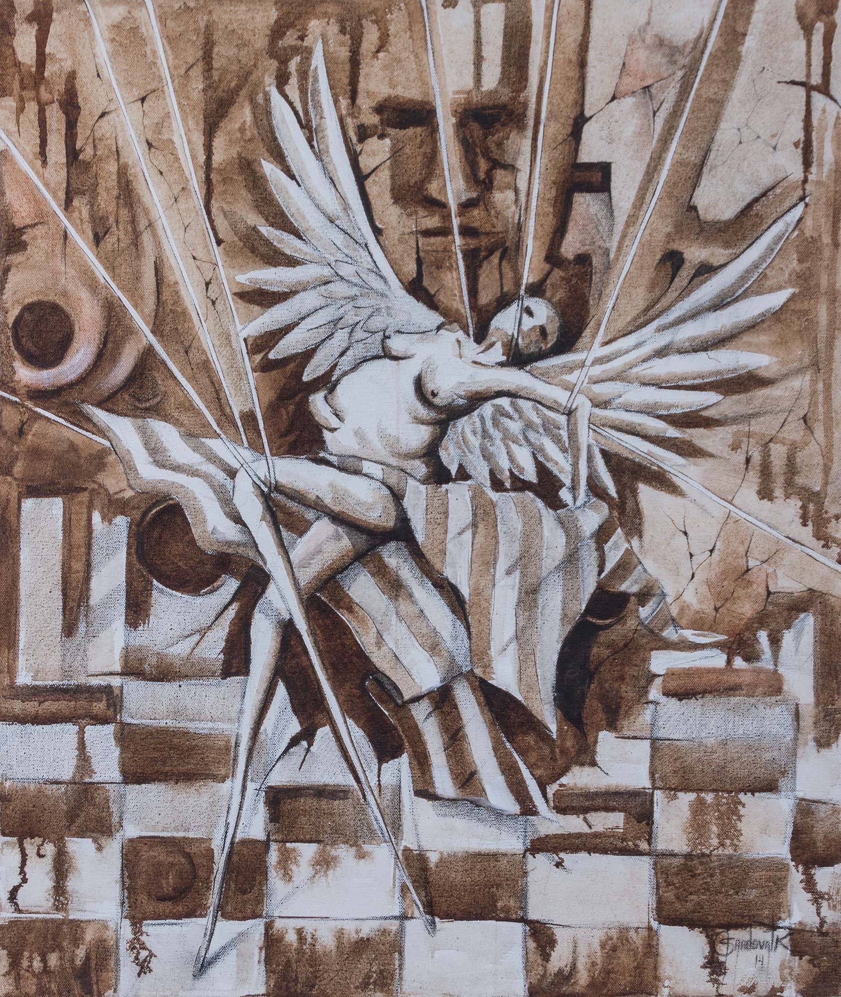 A pregnant woman with angel wings is destined to evoke myriad emotions in this painting by Juan Sandoval. "This composition shows the sweetness of a pregnant woman who wants to be free and flap her wings like an angel but at the same time she expresses sadness, anguish, and who is inconsolable at not being able to do it. She agonizes behind that intriguing look on her face. Hers is a surreal image, as if taken from a dream," says the Peruvian artist of this canvas. He combines walnut stain and pencil with oil and acrylic paints to successfully achieve a mystical ambience.