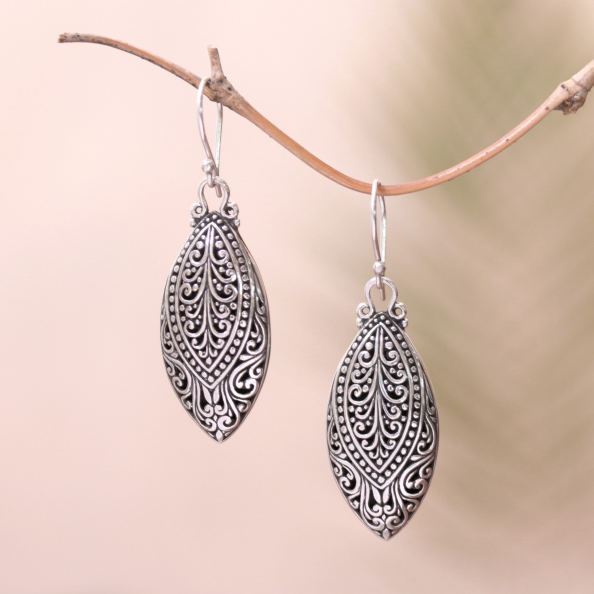 Evoking antiquities, these marquise-shaped dangle earrings are crafted from sterling silver, detailed with intricate swirl and dot patterns that are accentuated by a combination of finishes. Wayan Asmana presents the earrings, crafted by Balinese artisans.