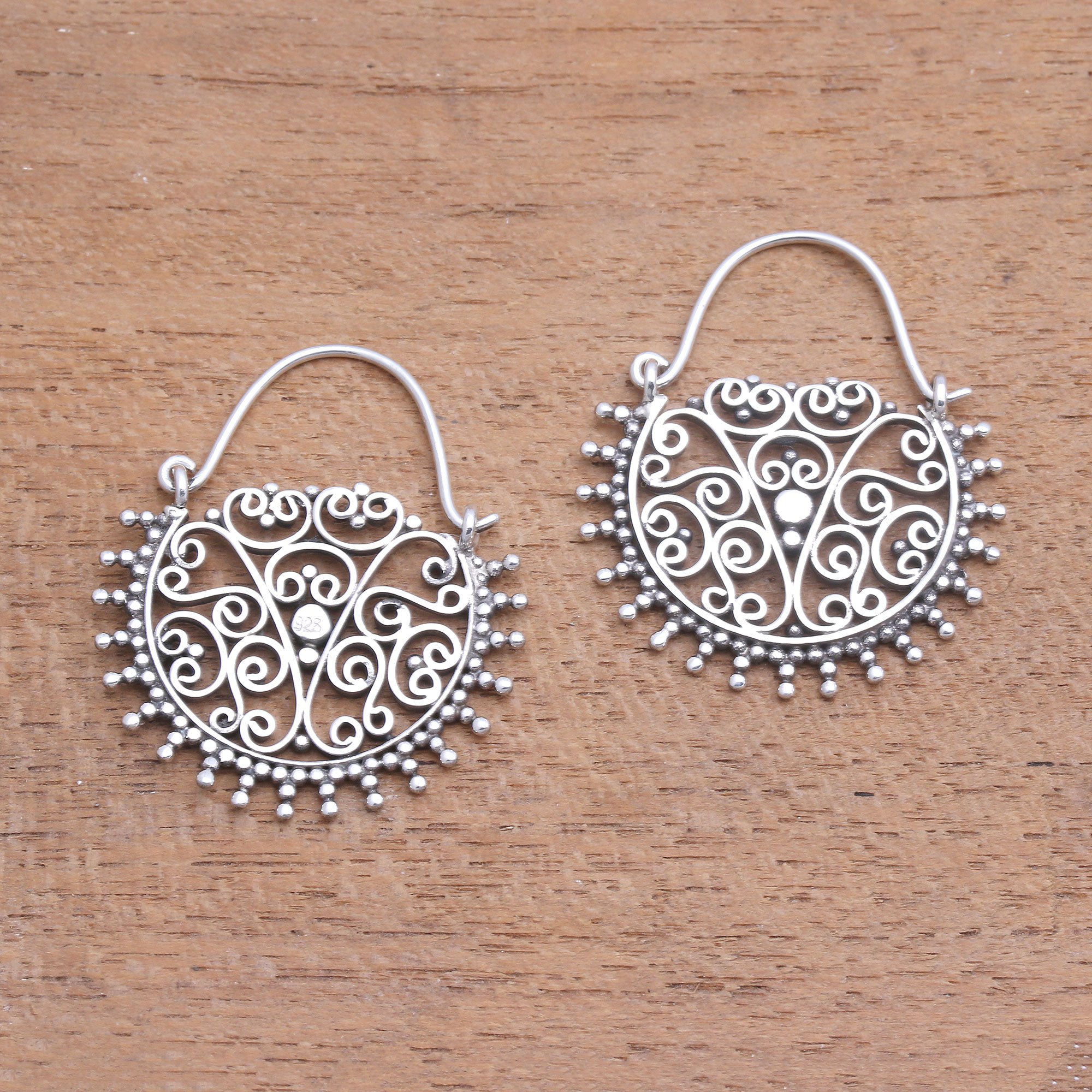 Crafted by hand, delightful openwork patterns in sterling silver decorate this pair of hoop earrings from Bali. Made Darmada creates these earrings, which are accented by coronas of dots.