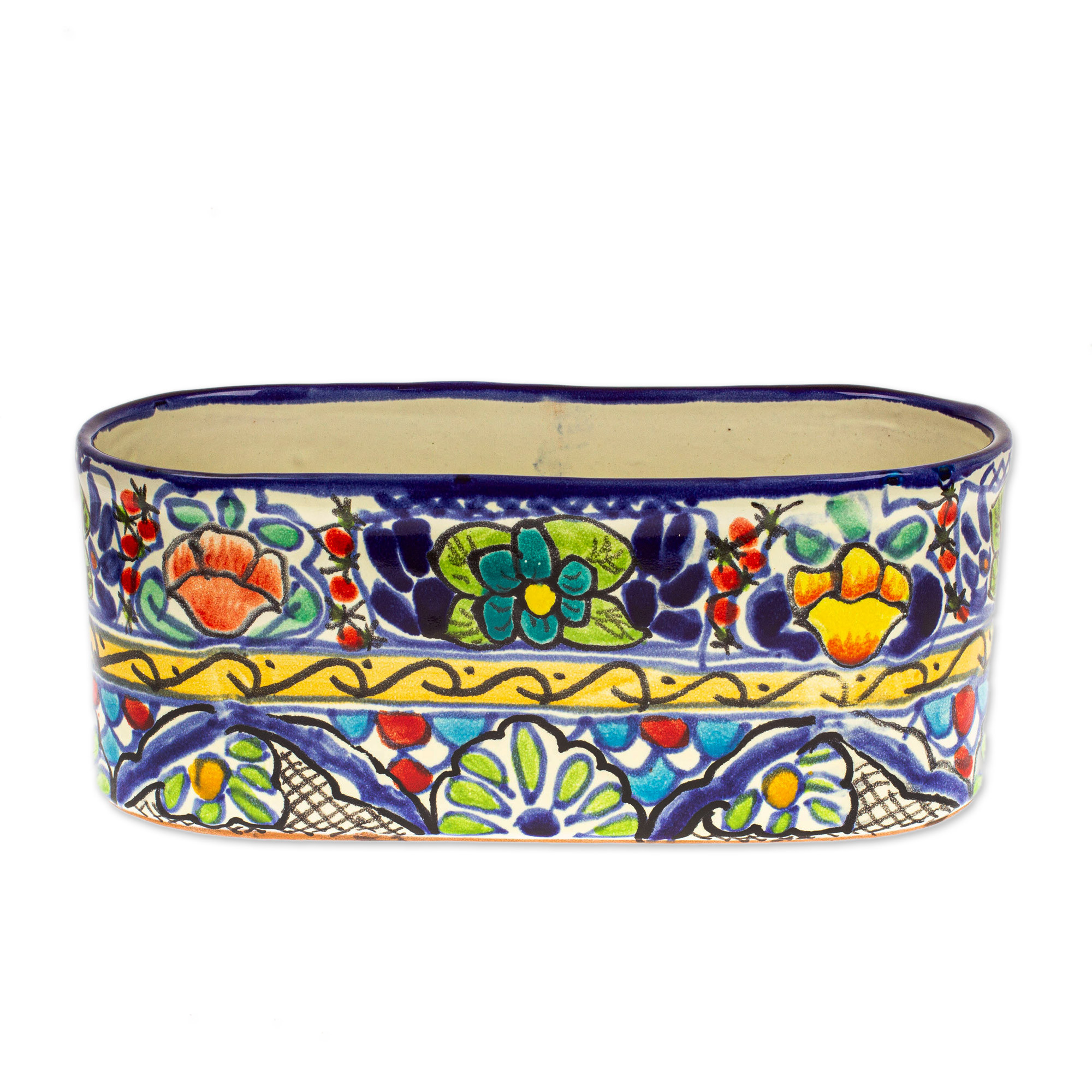 Talavera Style Ceramic Oval Pot from Mexico, 'Garden Bliss'