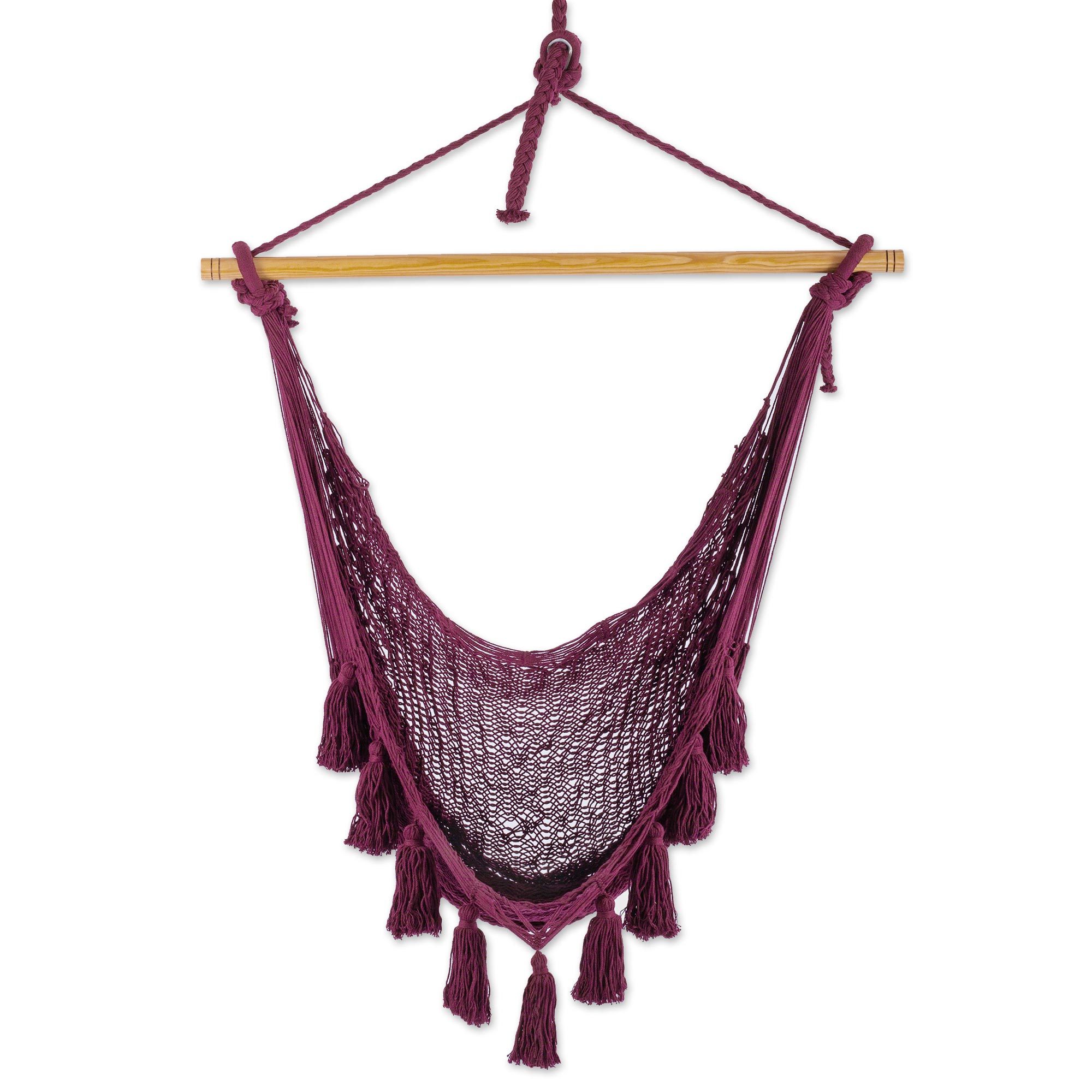 Tasseled Cotton Rope Mayan Hammock Swing in Wine from Mexico, 'Ocean Seat in Bordeaux'