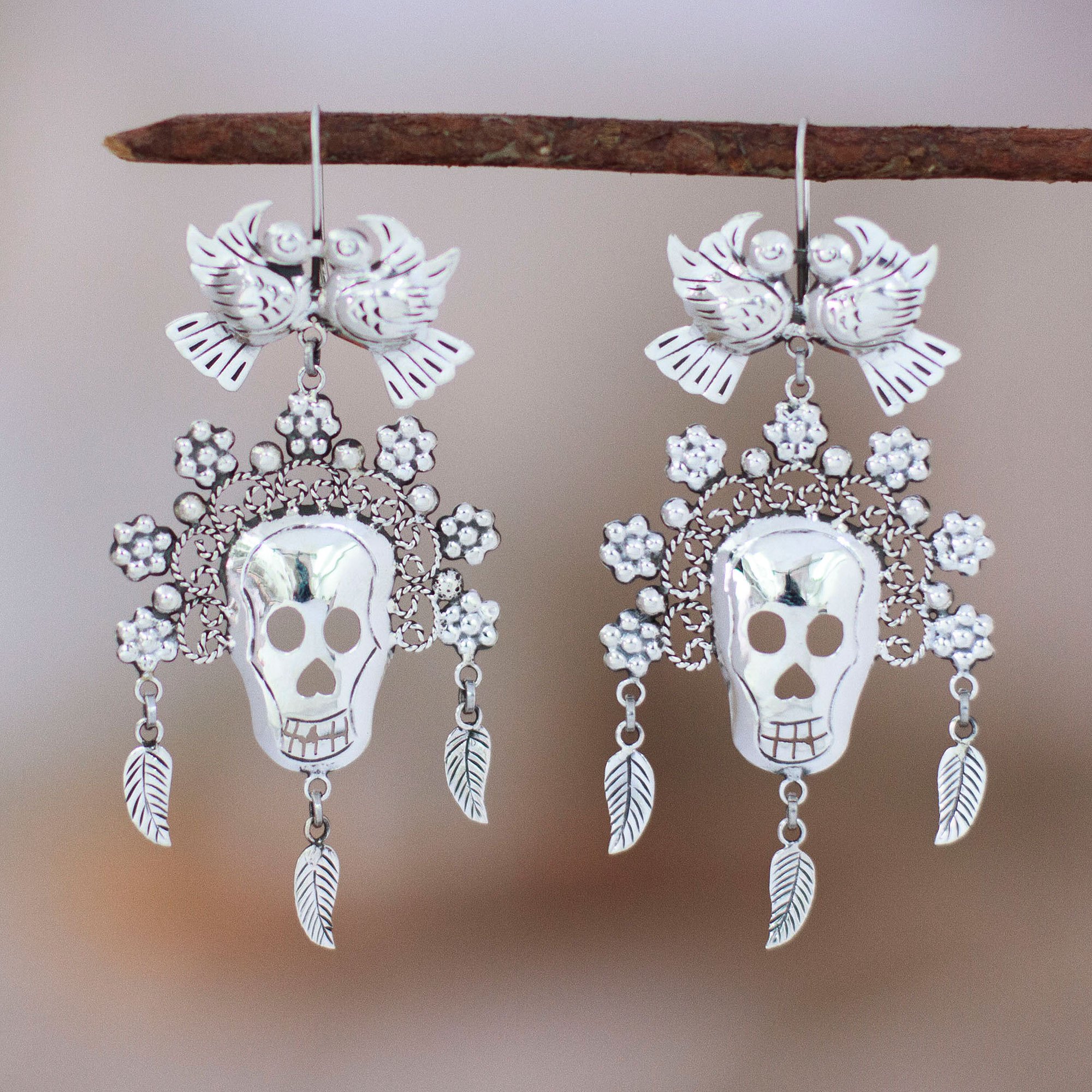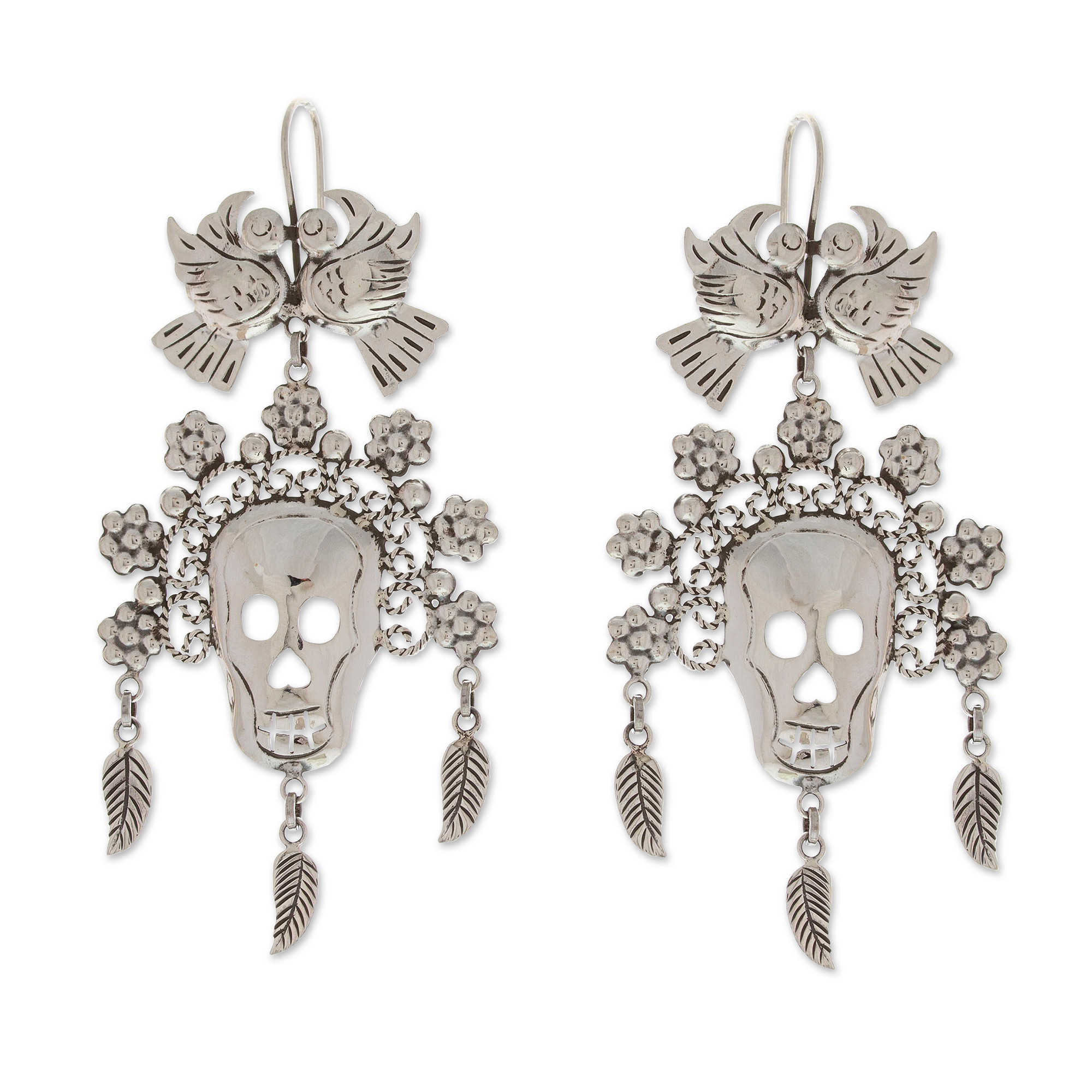 Roy Nilson's exquisite sterling silver dangle earrings beautifully feature Catrina, the iconic figure of Mexico's Day of the Dead festivities, adorned with a majestic floral headdress and graceful doves. With their refined luster and captivating sophistication, Nilson captures the regal charm of Catrina. Allow these exceptional accessories that pay homage to Taxco's revered silversmithing traditions to enhance your look with a touch of splendor.