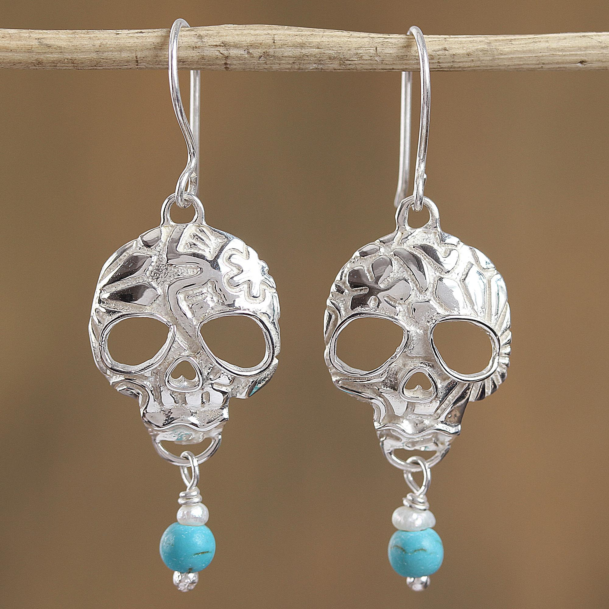Inspired by themes of the afterlife and Day of the Dead imagery, Mexican artisan Oscar Figueroa Escorcia creates a pair of dangle earrings in the tradition of Taxco silversmithing. Two striking skulls, detailed with intricate patterns, are crafted of sterling silver. Below each skull dangles a stone of natural turquoise alongside a glowing cultured pearl