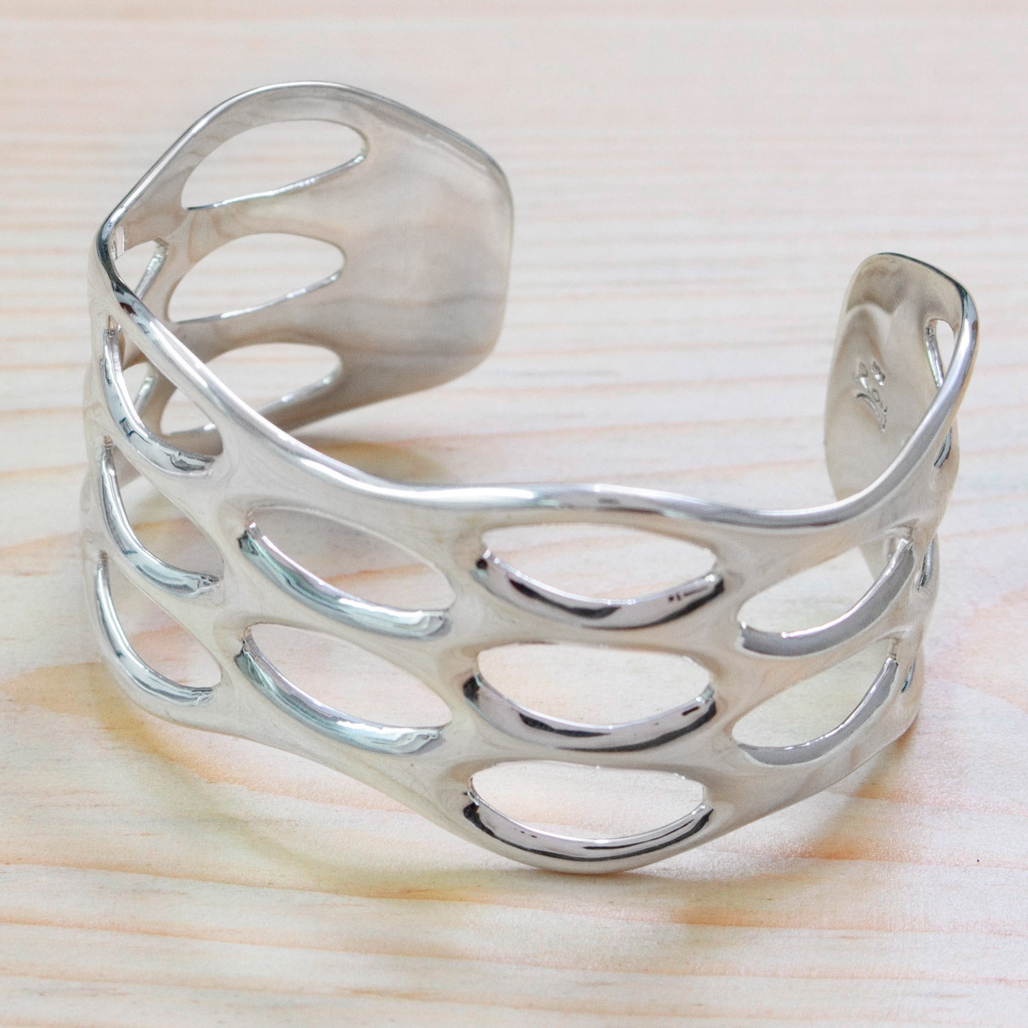 Taxco Sterling Silver Cuff Bracelet with Openwork Accents, 'Oval Splendor'