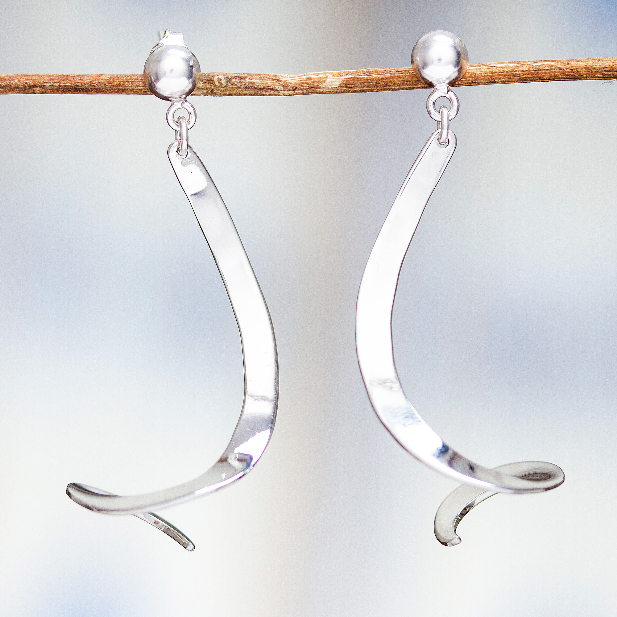 Squiggles of gleaming Taxco sterling silver become a stunning pair of dangle earrings. Ezequiel Tapia in Mexico designs and crafts the shapely pair.