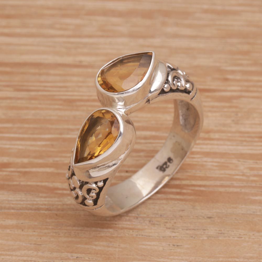 Totaling over one carat, two teardrops of yellow citrine crown this cocktail ring from Bali. Designed by Made Sugi, the ring is crafted of sterling silver with swirling patterns that flank the stones.