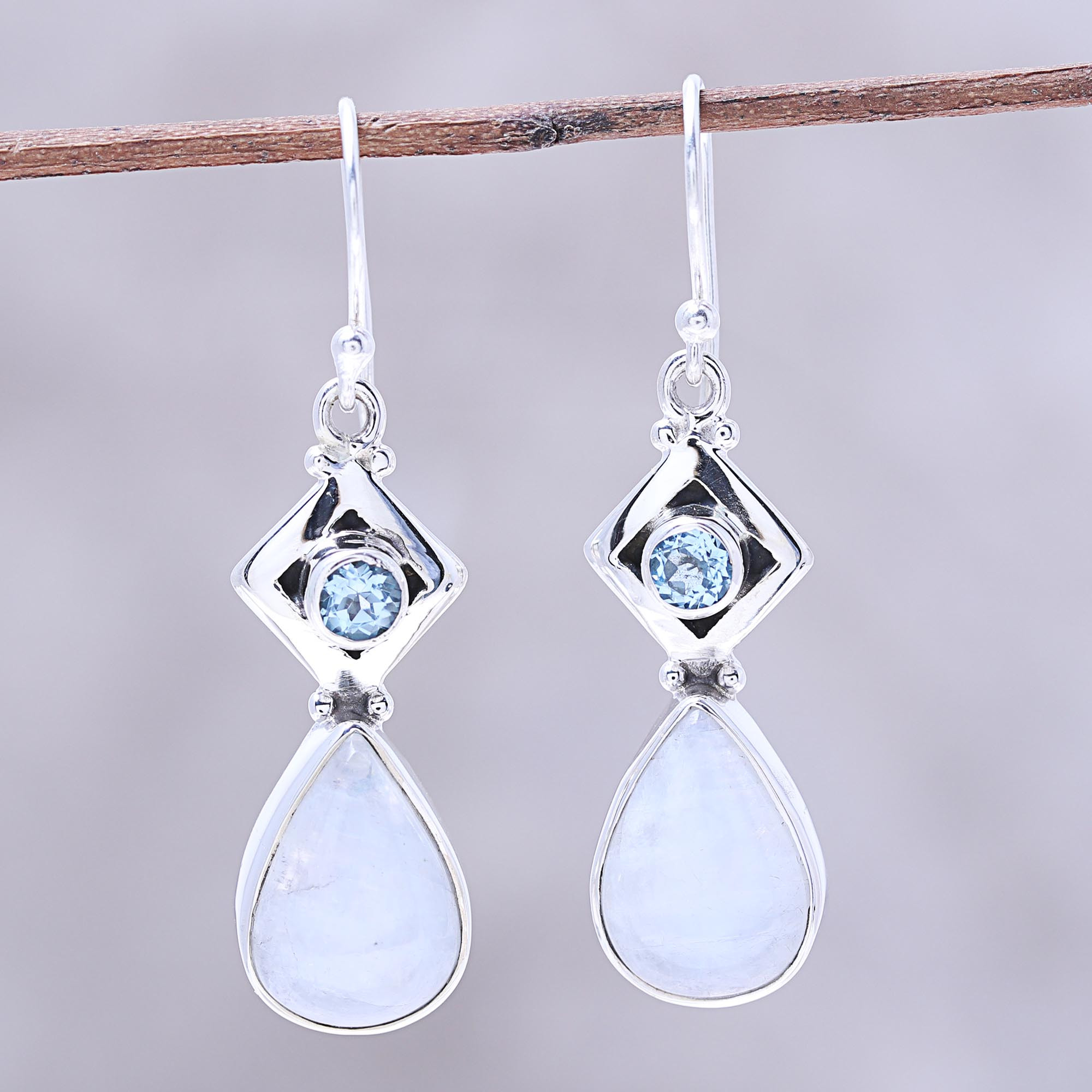 Earrings from Neeru Goel feature striking teardrops of natural rainbow moonstone. Above each teardrop, a sterling silver diamond cradles a petite faceted blue topaz.