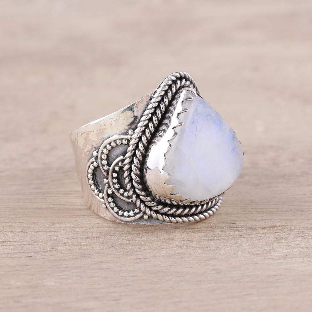 This cocktail ring designed by Neetu Barathi of India features a large rainbow moonstone cabochon in a rounded triangle shape with the majestic beauty of an iceberg rising from the sea. The rainbow moonstone is framed by two rows of rope motif sterling silver and set into a wide sterling silver band adorned with semi-circles of sterling silver dots.