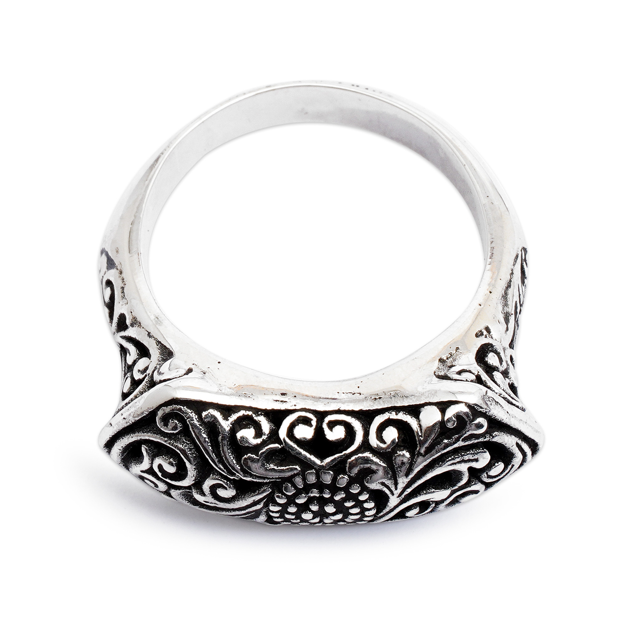 Turn heads with this bold sterling silver cocktail ring boasting a dramatic interplay of lustrous and darkened surfaces that create mesmerizing depth and dimension. Ancient Balinese patterns weave through contemporary design elements, resulting in a statement piece that bridges centuries of craftsmanship with today's fashion sensibilities. Artisan Ekayani's exquisite design is an unforgettable addition to any jewelry collection.