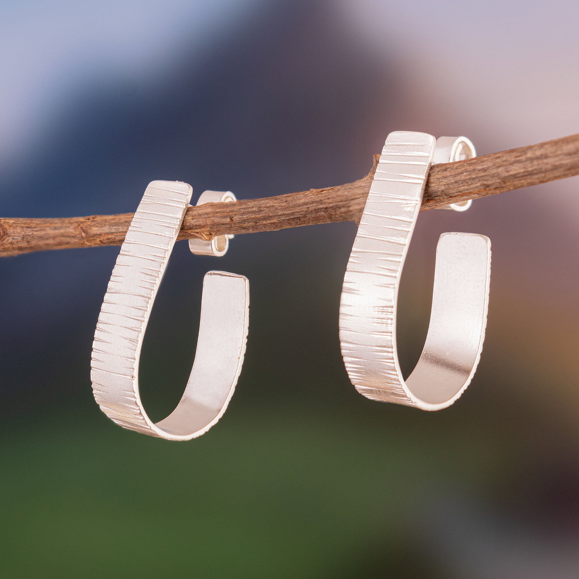 Textured Modern Sterling Silver Half-Hoop Earrings from Peru, 'Textured Elegance'