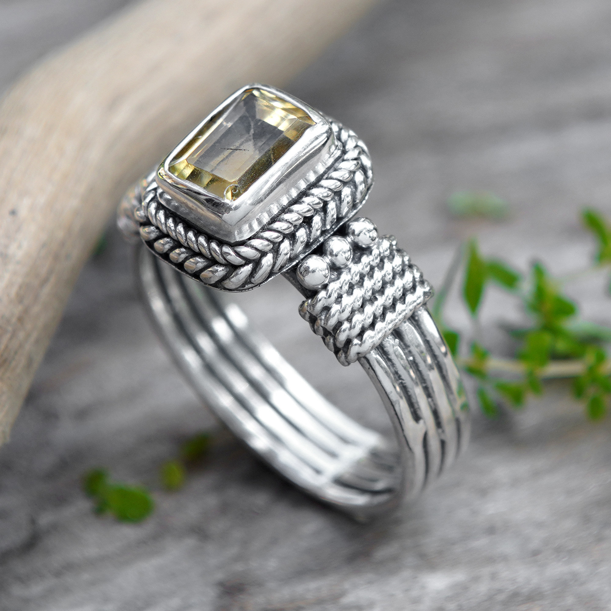 Balinese artisan Anya creates a striking single stone ring meant to turn heads. Rich textures and a scintillating octagonal citrine gem make this heavenly sterling silver design stand out. The fabulous ring is a timeless accessory that will become a glamorous addition to your collection.
