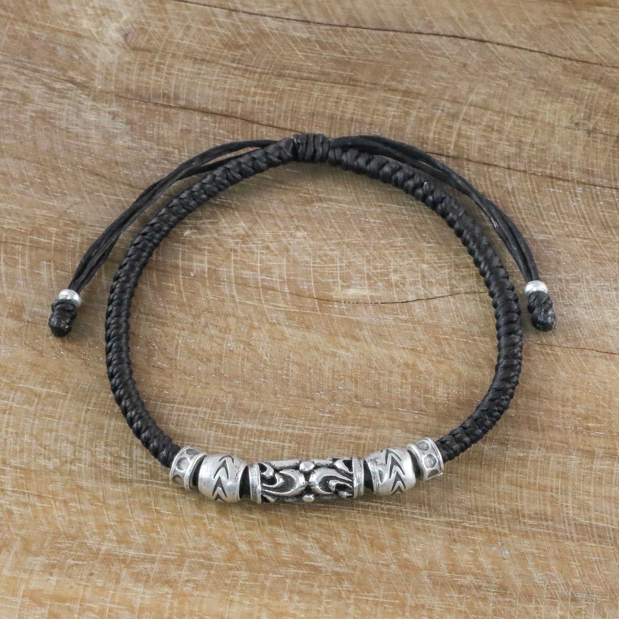 The Karen hill tribe artisans from Thailand are known for making jewelry unique to their corner of the world. Artisan Napapat comments that their works are "...very creative and beautiful, but also distinctly Thai: their methods unchanged from mother to daughter." Here she presents a hand braided ebony colored cord bracelet with a barrel-shaped silver tube flanked on each side by two beads; the detailing of the tube's filigree motif and the bead's decorations is further enhanced by the combination finish of the metal. The sliding knot closure makes it easy to adjust the bracelet so that the fit will always be perfect.