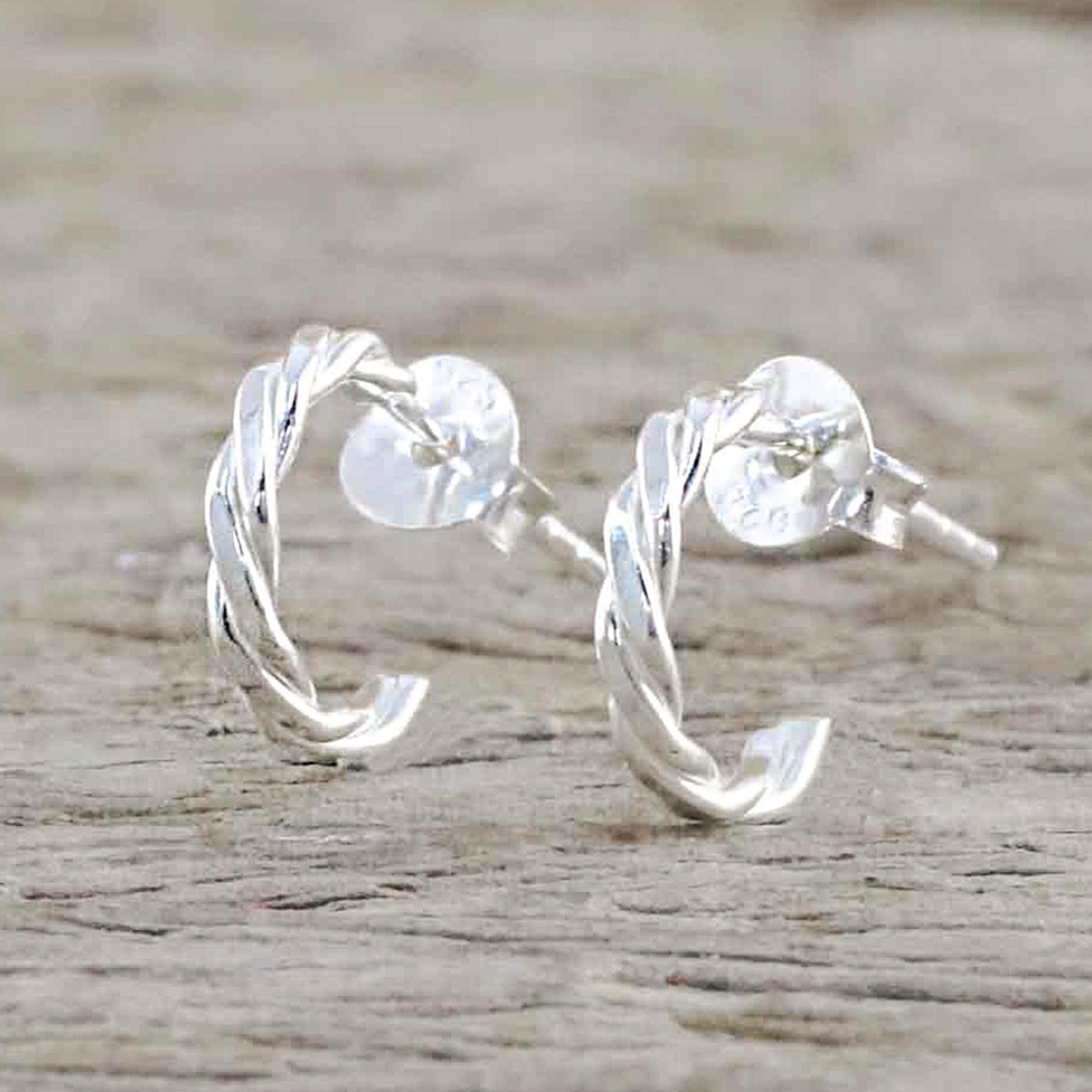 Thai Artisan Crafted Sterling Silver Half Hoop Earrings, 'Intricately Minimal'