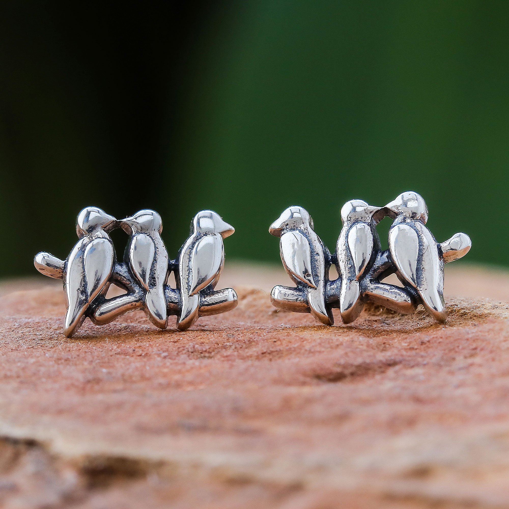 Thai Artisan Handcrafted Sterling Silver Button Earrings, 'Twittering Trio'