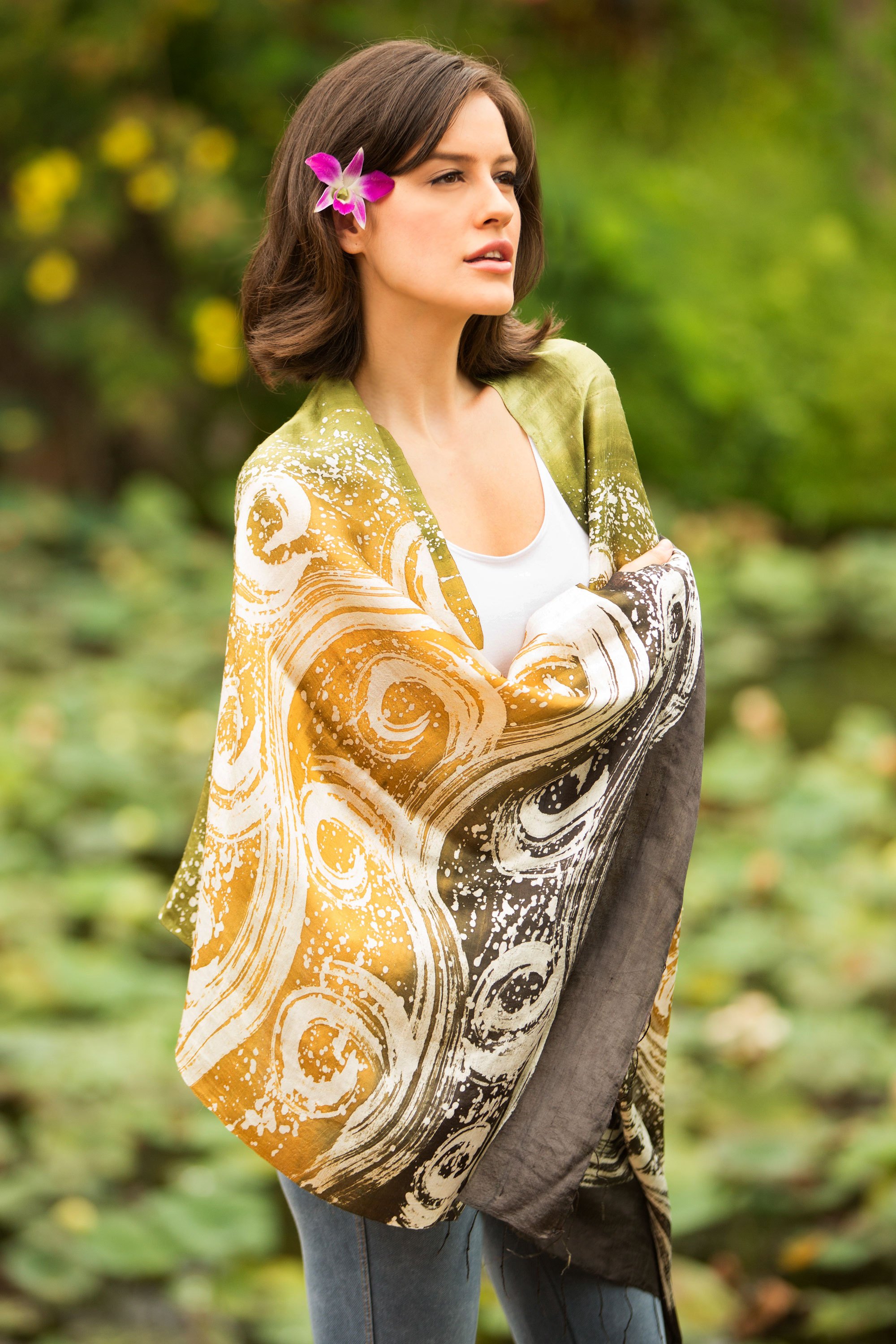 Display luxurious style with this vibrant shawl, alive with the flare of white fireworks bursting against a background of black, gold and olive green. Vinita of Thailand brings you this elegant wrap, artistically handcrafted with traditional batik techniques on fine silk.