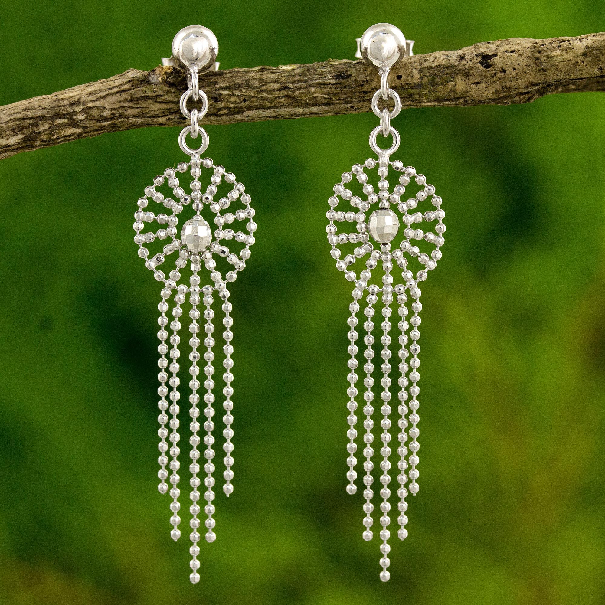 Thai Chandelier Earrings Handcrafted in Polished 925 Silver, 'Moonbeam Cascade'