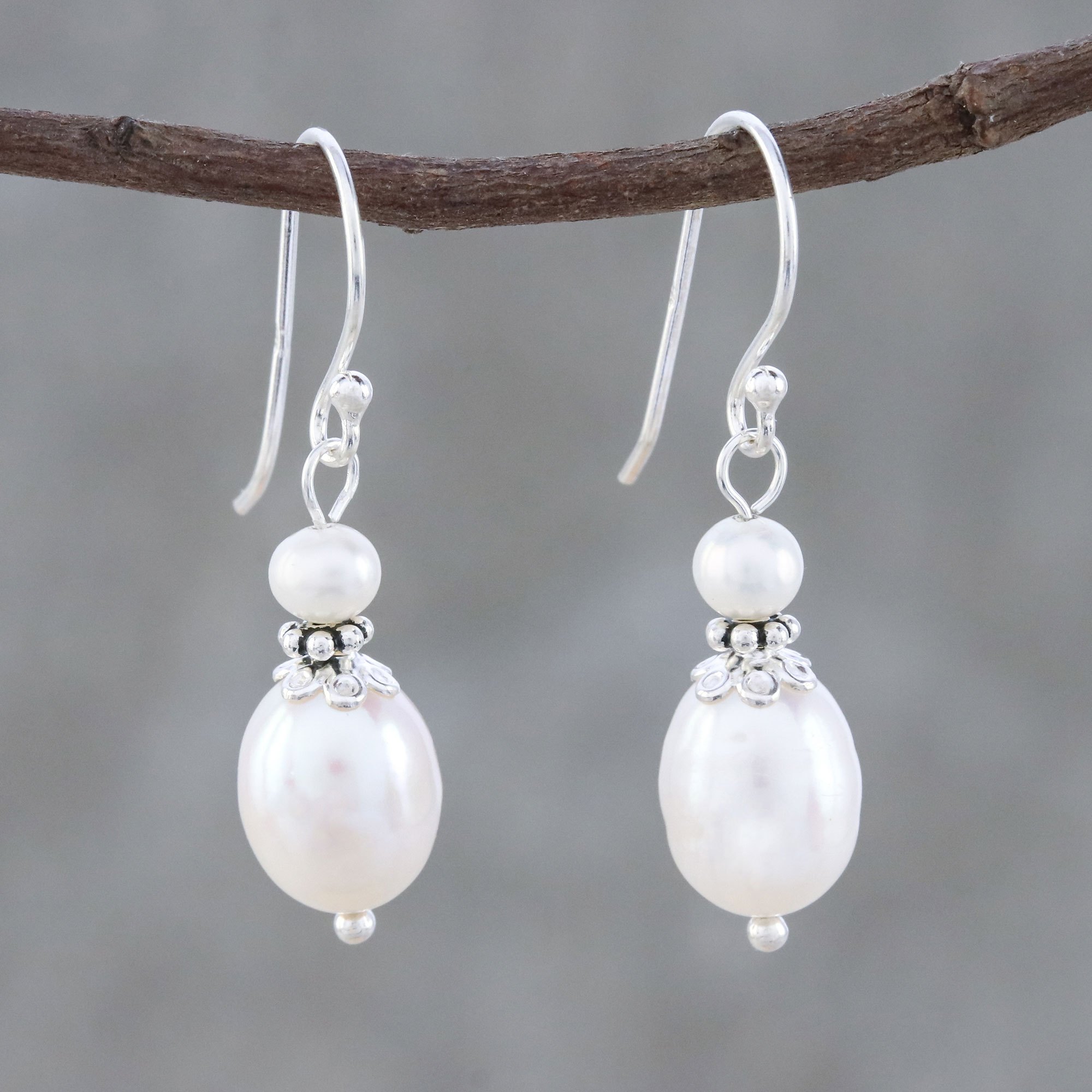 Thailand artisan Tipa works alongside her family to create this beautiful pair of dangle earrings. Crafted from sterling silver, each earring features a peachy oval cultured pearl crowned with petite beads of silver and a round white cultured pearl. Tipa uses a high polish finish to accentuate the luxurious appeal of her design.