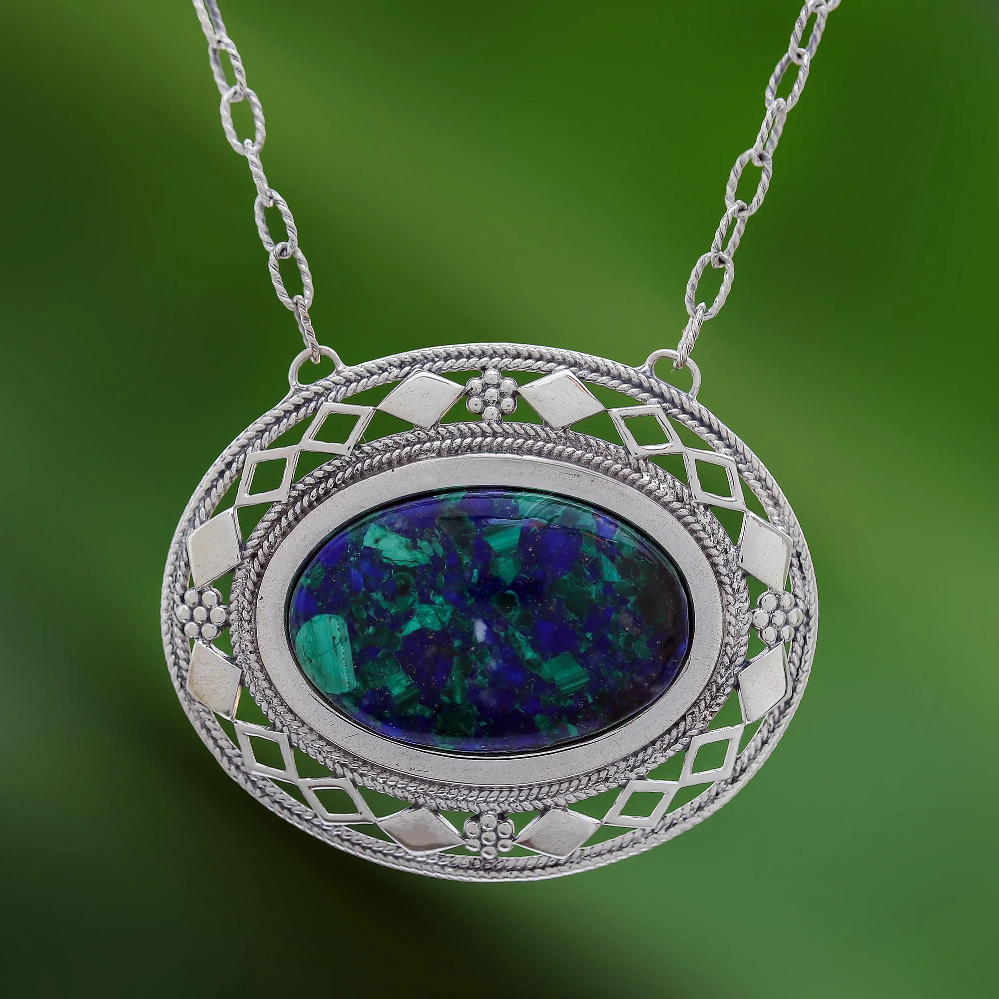 Thai Handcrafted Azure-Malachite and Silver Necklace, 'Infinite Sea'