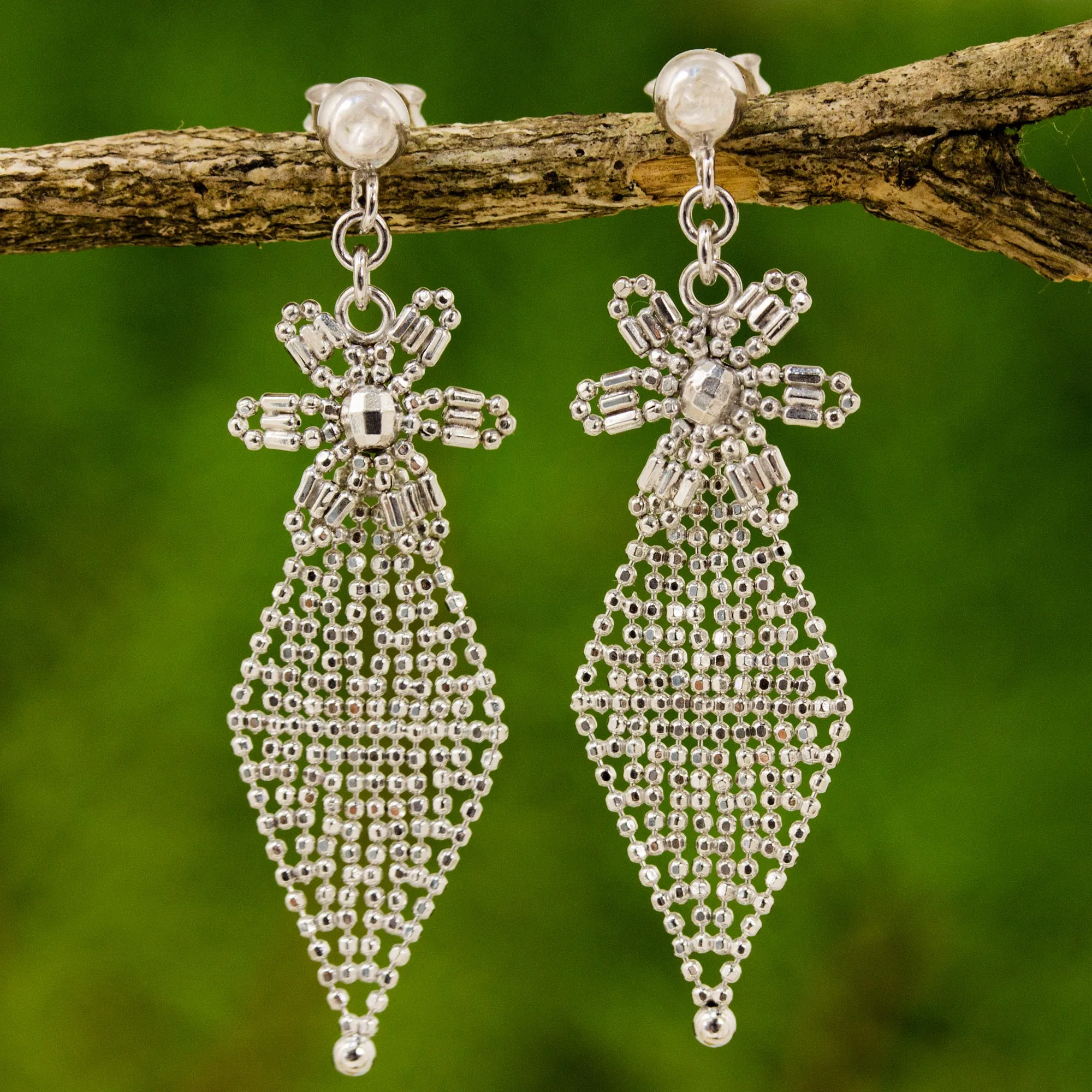 By Angels, these delightful earrings are crowned by daisies. Sterling silver diamonds fall from the flowers. The talented Thai artisan crafts her design by hand using diminutive ball chains in creative ways.