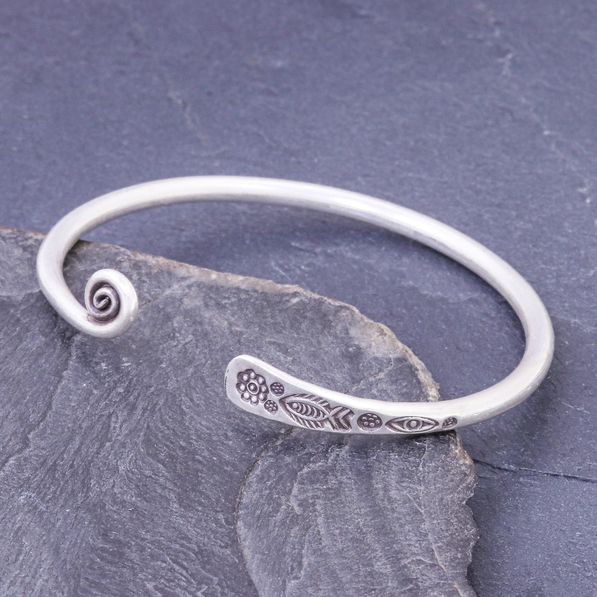 A stamped fish and flower design mark one end of this delightful sterling silver cuff bracelet from Thailand's Pakaon Sojintarit. The opposite end of the bracelet curls into a pretty spiral with an oxidized finish.
