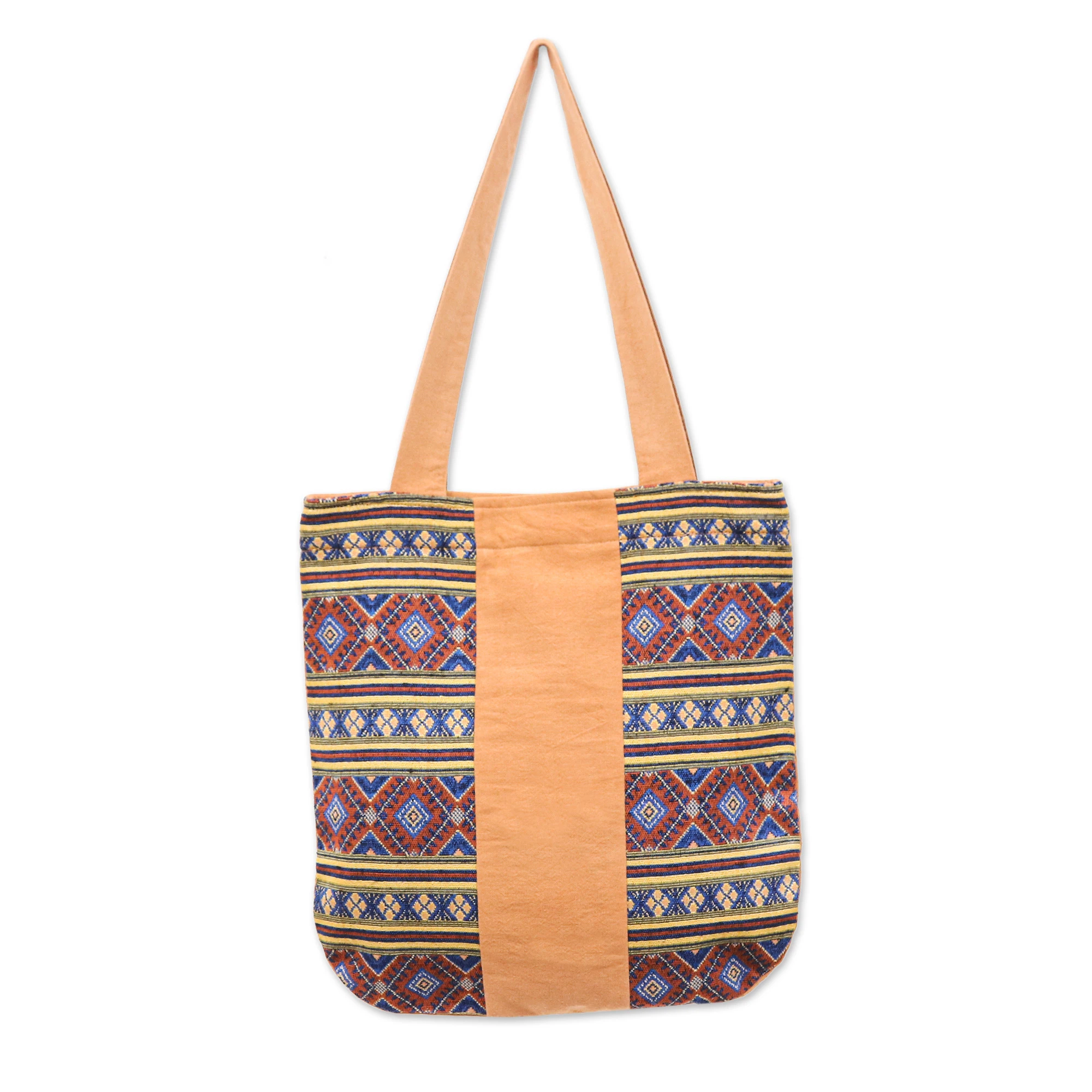 Thai-Inspired Brown and Blue Zippered 100% Cotton Tote Bag, 'Lanna Brown'