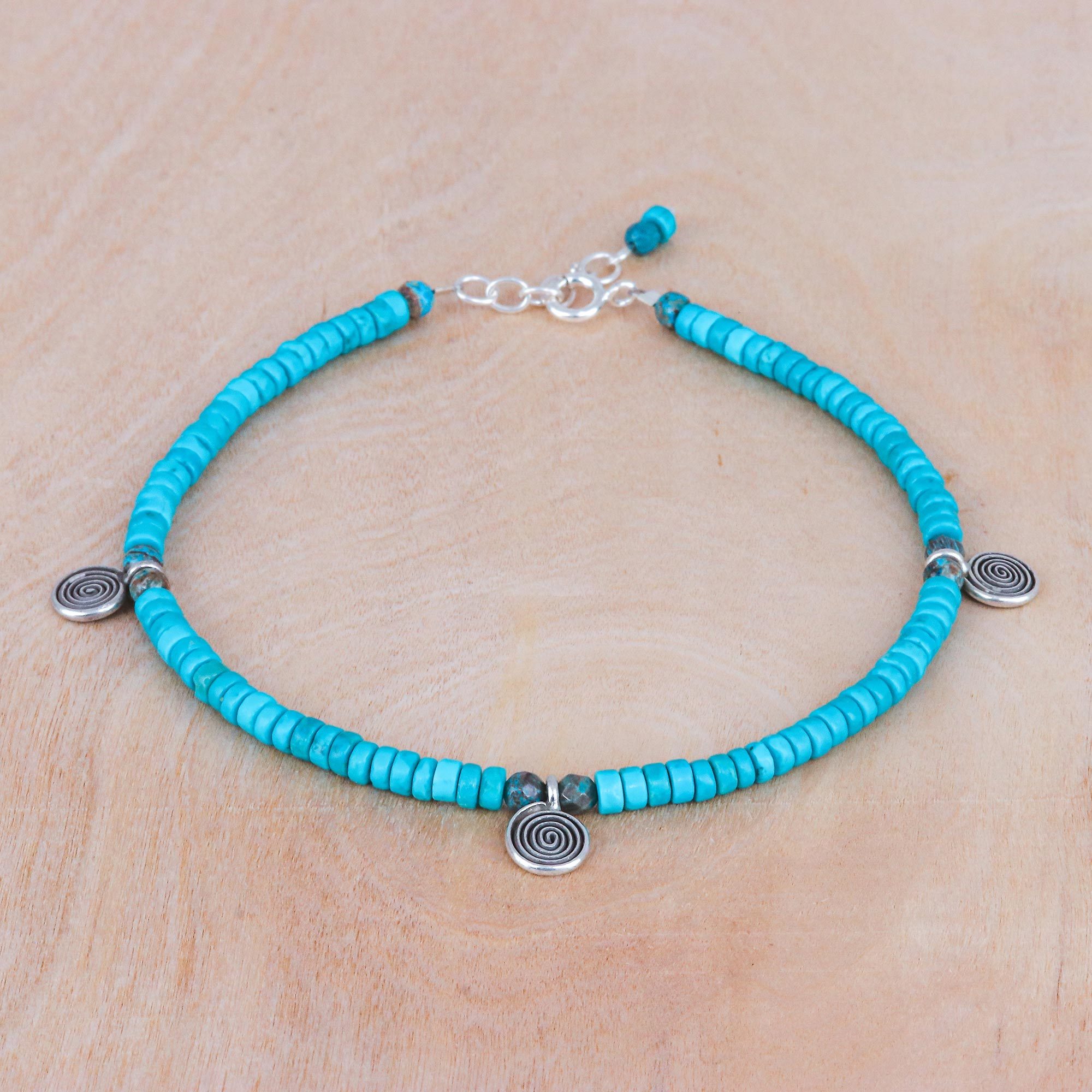 Shining silver spirals twinkle, dangling from the sides of Tipa's pretty anklet. The Thai artisan creates the anklet from reconstituted turquoise beads, crafting three 950 Karen silver spiral charms to add a moving element. Jasper beads and a 950 silver spring ring clasp finish the vividly hued anklet.